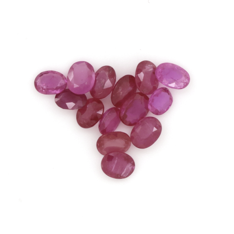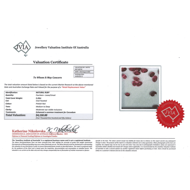 5.22CT TSW X 14 NATURAL RUBIES Oval Faceted Cut, Medium-Deep Pinkish-Red, Moderate Eye Visible Inclusions, Enhanced, Loose, Unset. Jewellery Valuations Provided By A Third Party Professional Not Directly Associated With Lloyds Auctions at AUD $4,150.00This Insurance Valuation has been provided by a registered Jewellery Valuer and is intended for insurance purposes only. The valuation amount has no bearing on the auction value of the item. Any questions regarding the valuation should be directed to the issuing Valuer (refer to contact details on the certificate) as Lloyds have no association or relationship with the Valuer or the valuation amount contained within the valuation. Condition: NEW 0645894+2323