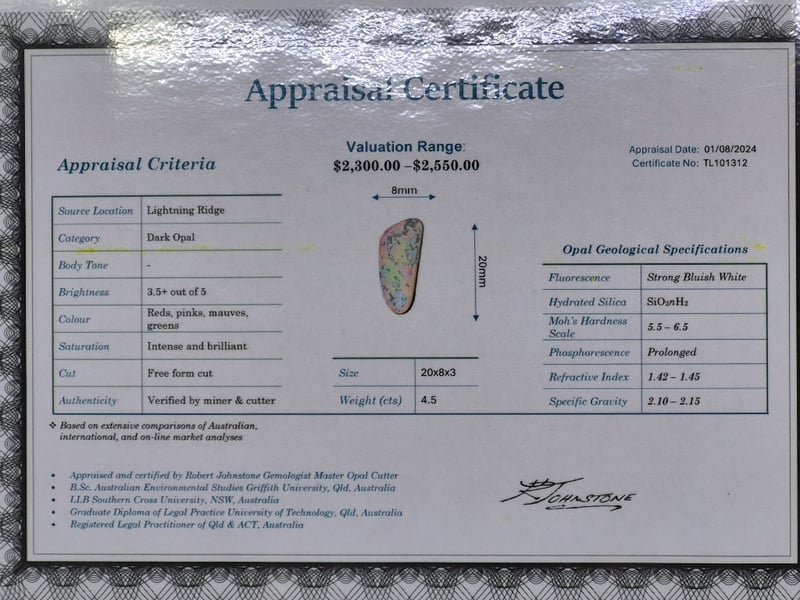 LIGHTENING RIDGE DARK OPAL 4.5CTSFree Form Cut Dark Opal, 4.5Cts, Complete With Certificate Of AuthenticityDimensions: Height: 20.00mm, Width: 8.00mm, Depth: 3.00mmCondition: Good - Refer To ImagesThis valuation has been conducted by an independent third-party professional. The valuation amount is an assessment by the issuing valuer and does not reflect the auction value of the item.Any inquiries regarding the valuation should be directed to the issuing valuer (refer to contact details on the certificate), as Lloyds Auctions has no affiliation or influence over the valuation, the valuer, or the stated amount.Insurance Replacement Valuation Amount: $2,300.00VAULT586289+7