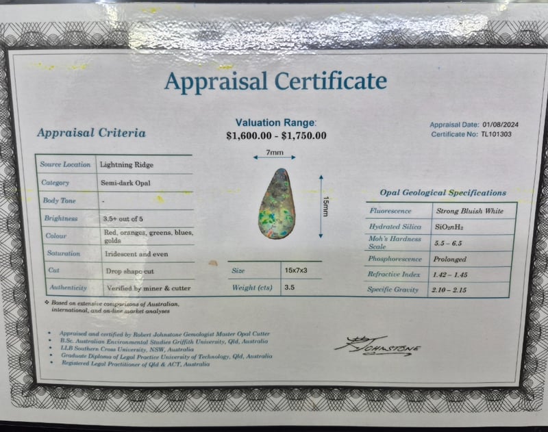 LIGHTENING RIDGE OPAL 3.5 TCWFree Form Cut Semi-Dark Opal, 3.5 Tcw, Complete With Certificate Of AuthenticityDimensions: Height: 15.00mm, Width: 7.00mm, Depth: 3.00mmCondition: Good - Refer To ImagesThis valuation has been conducted by an independent third-party professional. The valuation amount is an assessment by the issuing valuer and does not reflect the auction value of the item.Any inquiries regarding the valuation should be directed to the issuing valuer (refer to contact details on the certificate), as Lloyds Auctions has no affiliation or influence over the valuation, the valuer, or the stated amount.Insurance Replacement Valuation Amount: $1,600.00VAULT586289+8