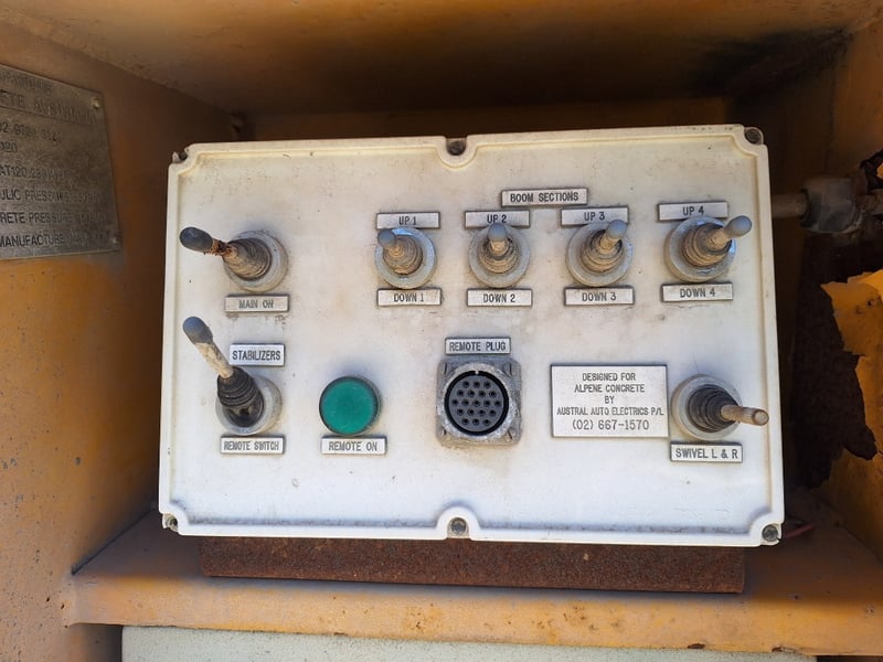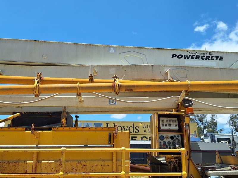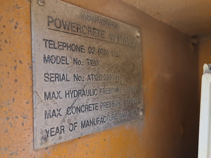 Description/Extras: Air-Conditioning, GME TX4500 UHF, Axis Reverse Camera, Stereo, Power Windows, Power Mirrors, Spotlights, Diff Lock, Powercreate Australia Rear Pump DOM 2001, Model T120, Serial No: AT120.230.152, Hours Indicated: 19,369.4Hrs, Worthington Concrete Boom, DOM 1989, Boom Model, WNPR536, MAX Height 36m
