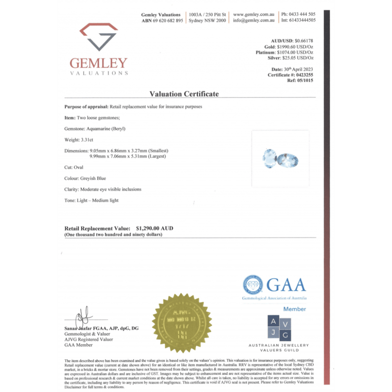 This Insurance Valuation has been provided by a registered Jewellery Valuer and is intended for insurance purposes only. The valuation amount has no bearing on the auction value of the item. Any questions regarding the valuation should be directed to the issuing Valuer (refer to contact details on the certificate) as Lloyds have no association or relationship with the Valuer or the valuation amount contained within the valuation.