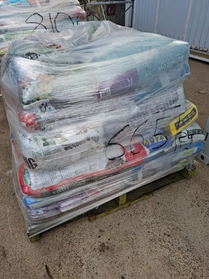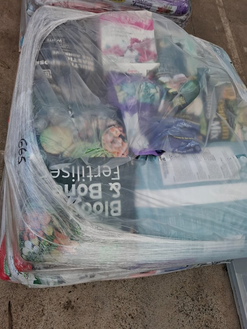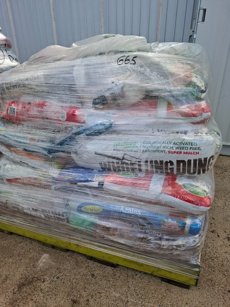 Assortment Pallet Of Gardening Soils Includes Fruit And Citrus Food, Gypsum Clay Breaker, Designer Mulch Classic Red, Slow Release Lawn Food.
