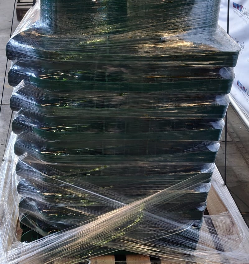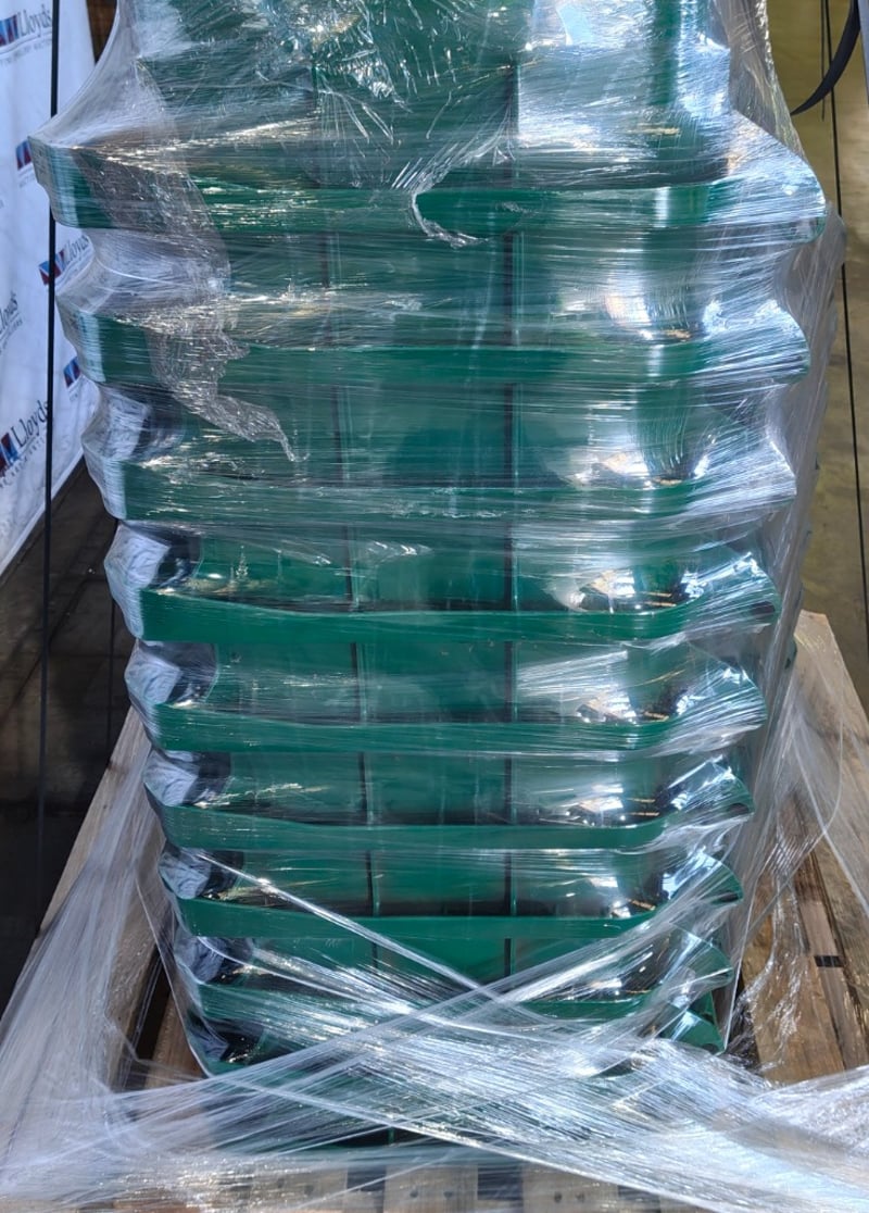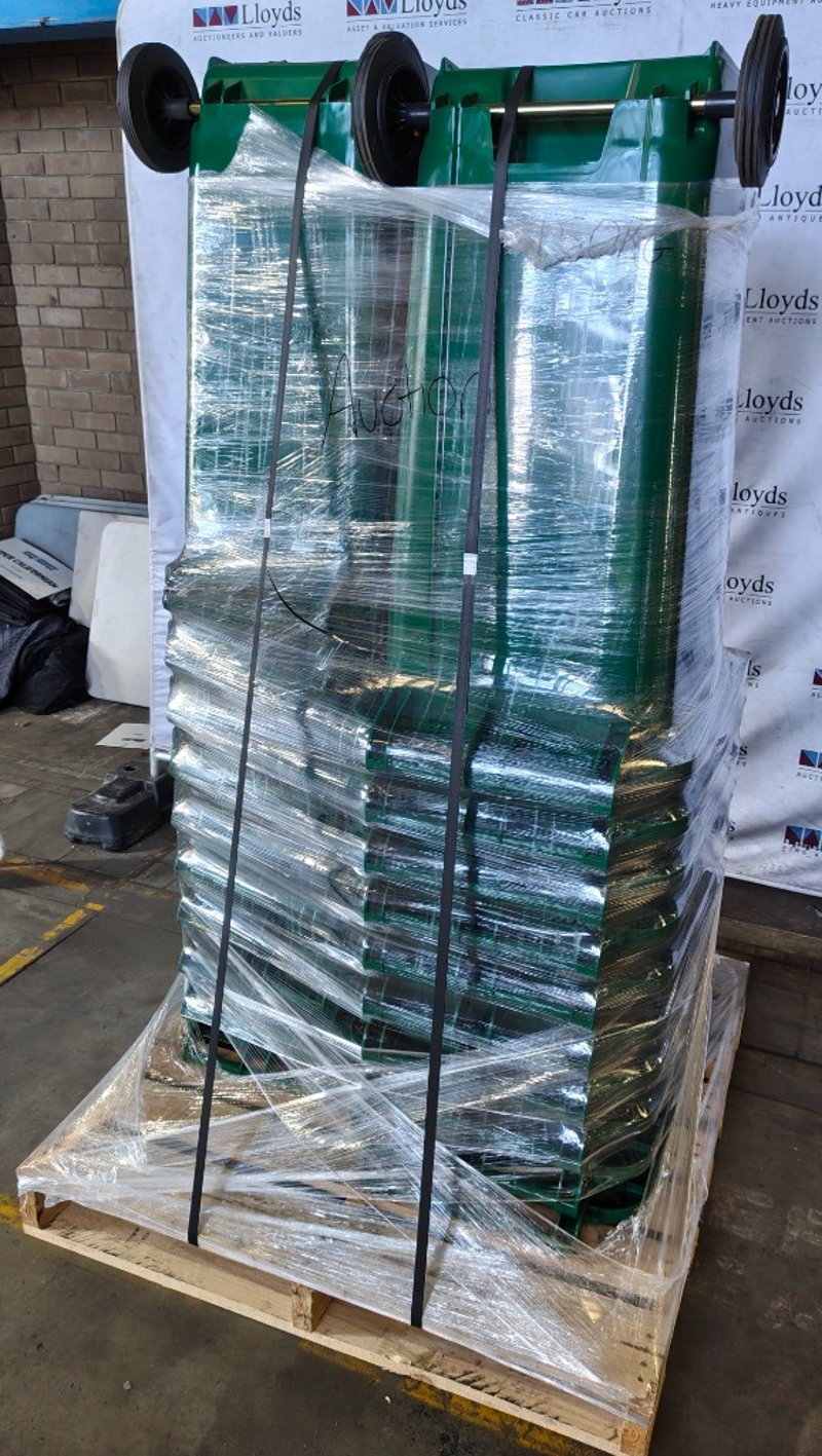 Assortment pallet of green plastic wheelie bins10 x 58cm (H) x 72cm (W) x 106 (D)10 x 47cm (H) x 56cm (W) x 86cm (D)Note: Inspection recommended, no lids, missing wheelsSold as lot