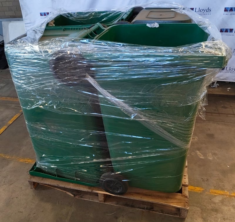 Assortment pallet of green plastic wheelie binsDimensions: 57cm (W) x 72cm (H) x 100cm (D)QTY: 4Note: Inspection recommended, no lids, damage on binsSold as lot