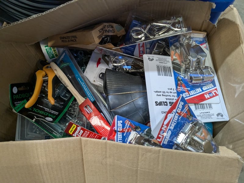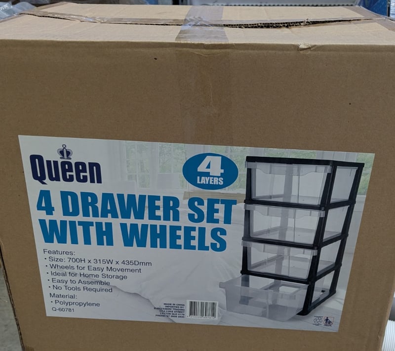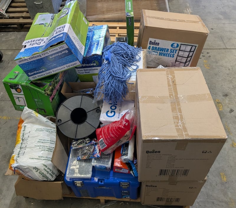 1 x Pallet of home and hardware items, including Gecko indoor & commercial insect killer, assorted battery clips, Queen 4 drawer storage units, and moreNote: Boxes show Damage and may have parts missing, electric/battery items in unknown working condition, items may have water damage, items may have missing partsInspection Recommended Sold As Lot