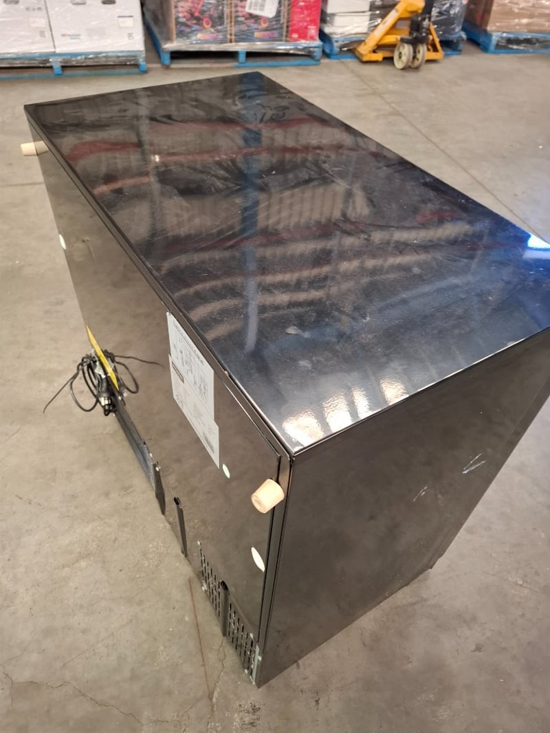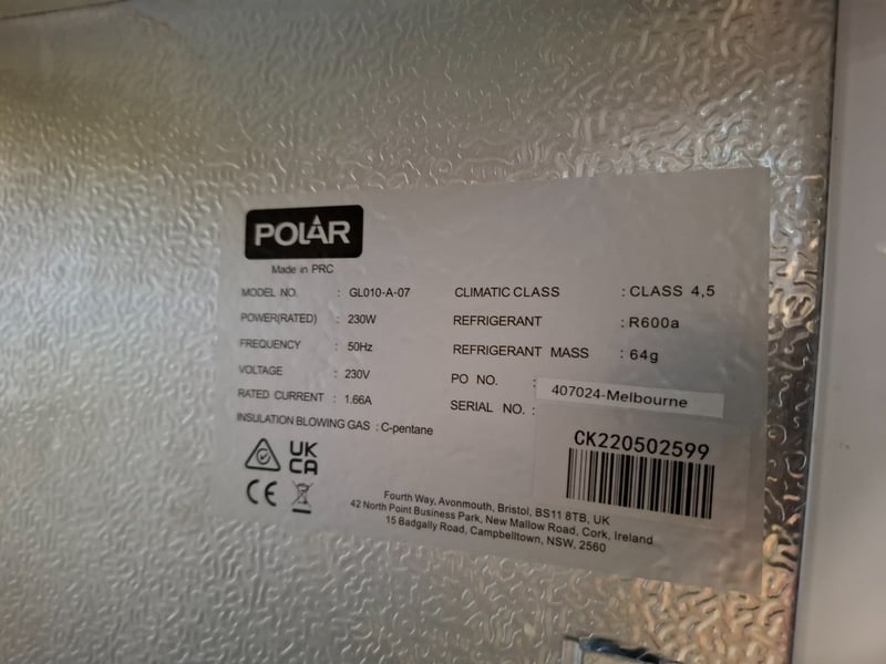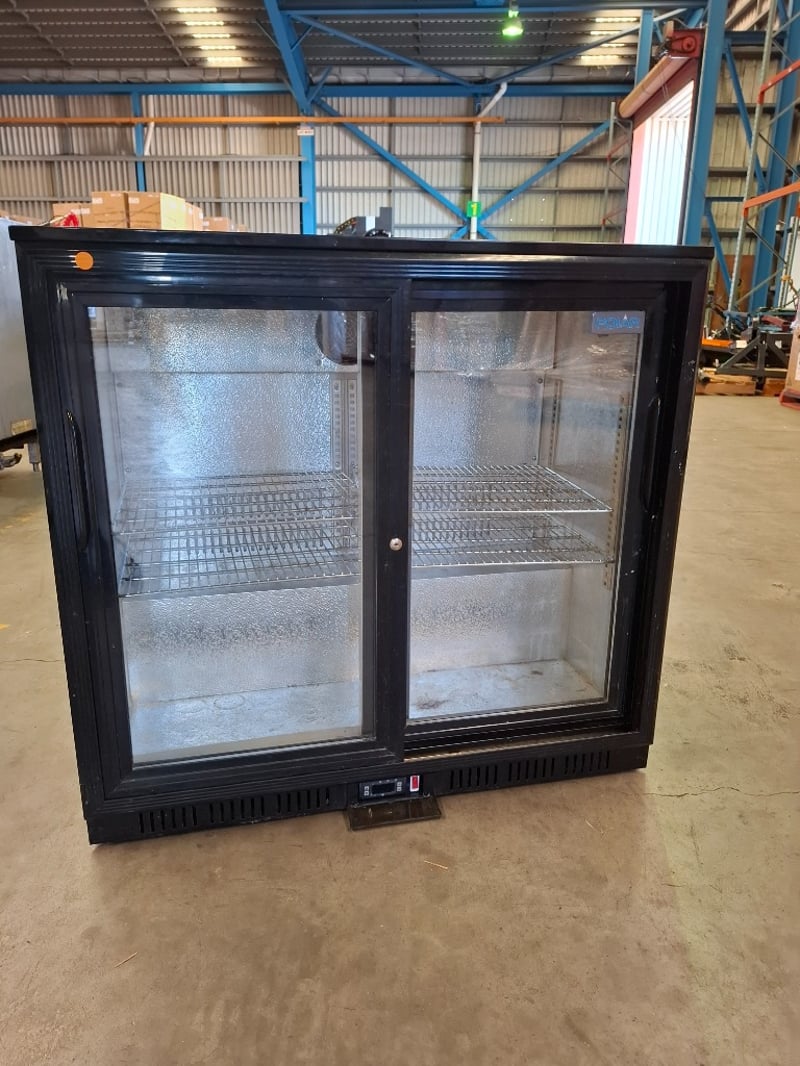 Back bar coolerMake: SolarModel: GL010-A-07Serial: CK220502599Dimensions: 90cm(W) x 54cm(D) x 84cm(H)Description/ Extras: refrigerated, 2 Sliding glass door with lock, not key, 1 phase, 10 Amp, black , scratches , cleaning required