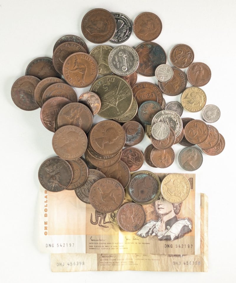 Australian $1 Note Qty 2. Australian Penny Qty 31. Assorted Coins Qty 31