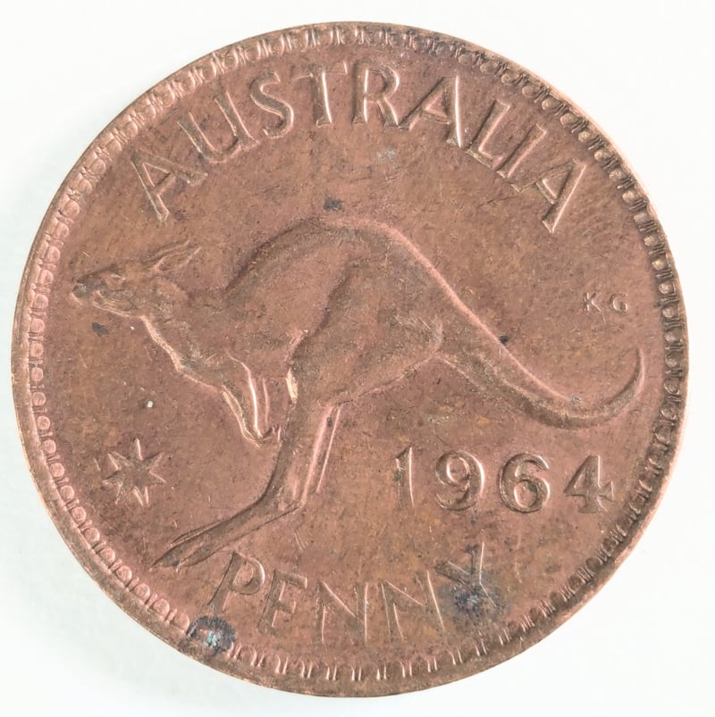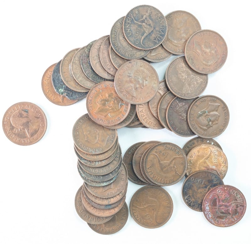 Australian Penny 1927 Qty 3, 1932 Qty 2, 1933 Qty 1, 1936 Qty 3, 1938 Qty 5, 1939 Qty 3, 1943 Qty 3, 1945 Qty 2, 1947 Qty 2, 1950 Qty 4, 1951 Qty 4, 1958 Qty 5, 1959 Qty 3, 1962 Qty 2, 1964 Qty 4, 1969 Qty 2.