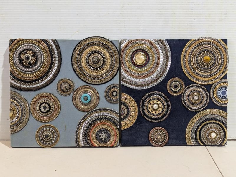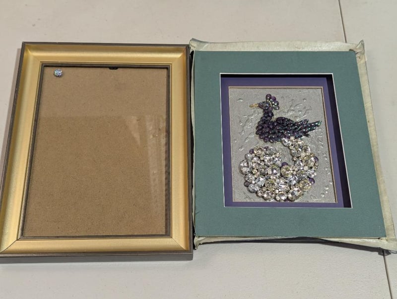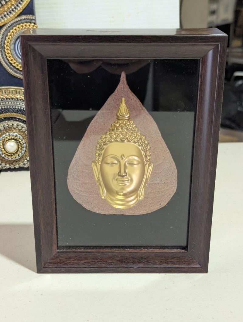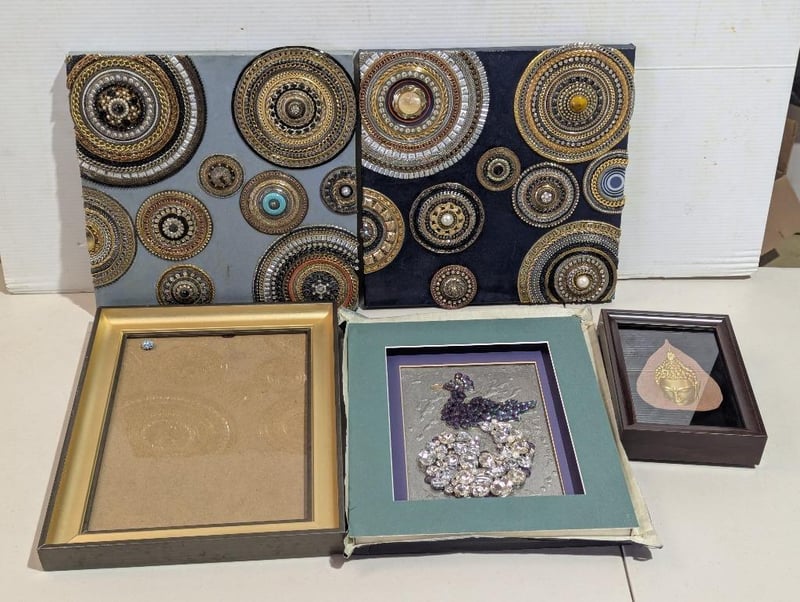 2 x Hand made Contempory wall art with beaded jewels & Chains on wood , 1 x contempory Peacock jewelled Show Box art, No frame, 1 x Gold Buddha Head in frame, 1 x gold frame measures 36 x 26.5cm