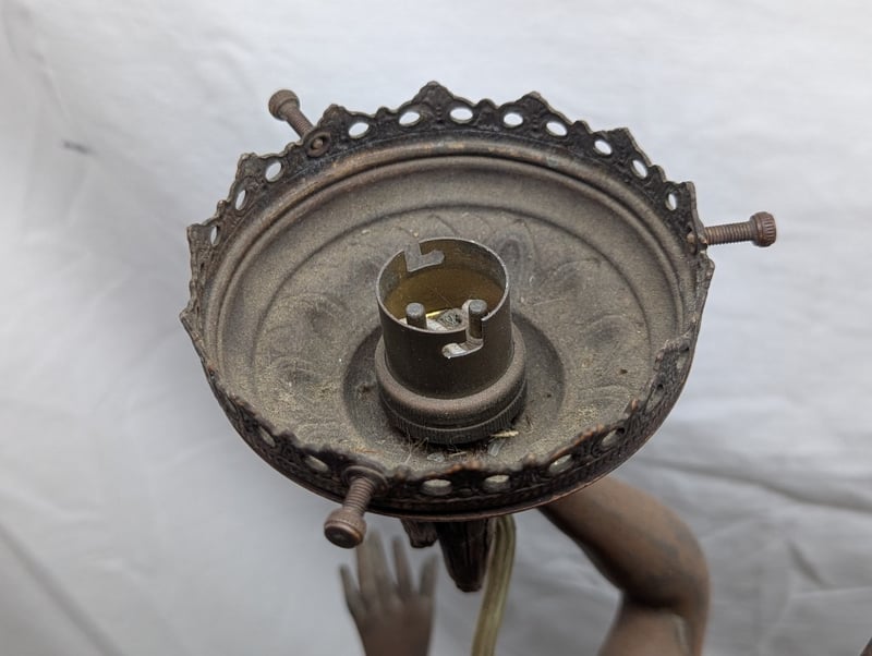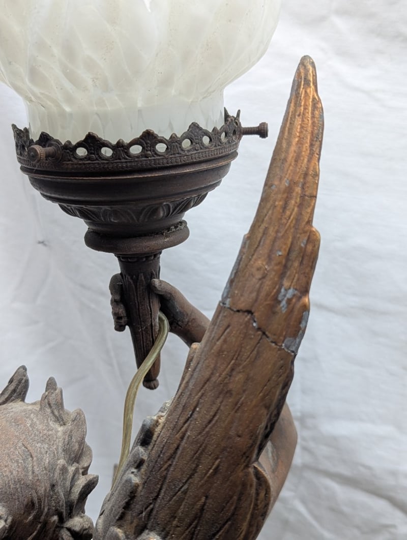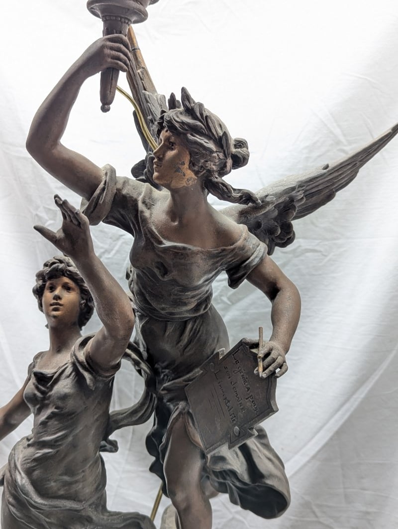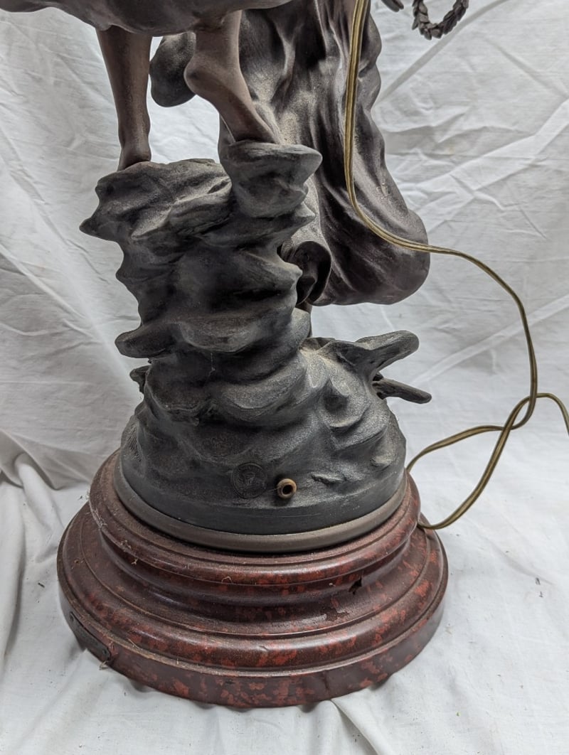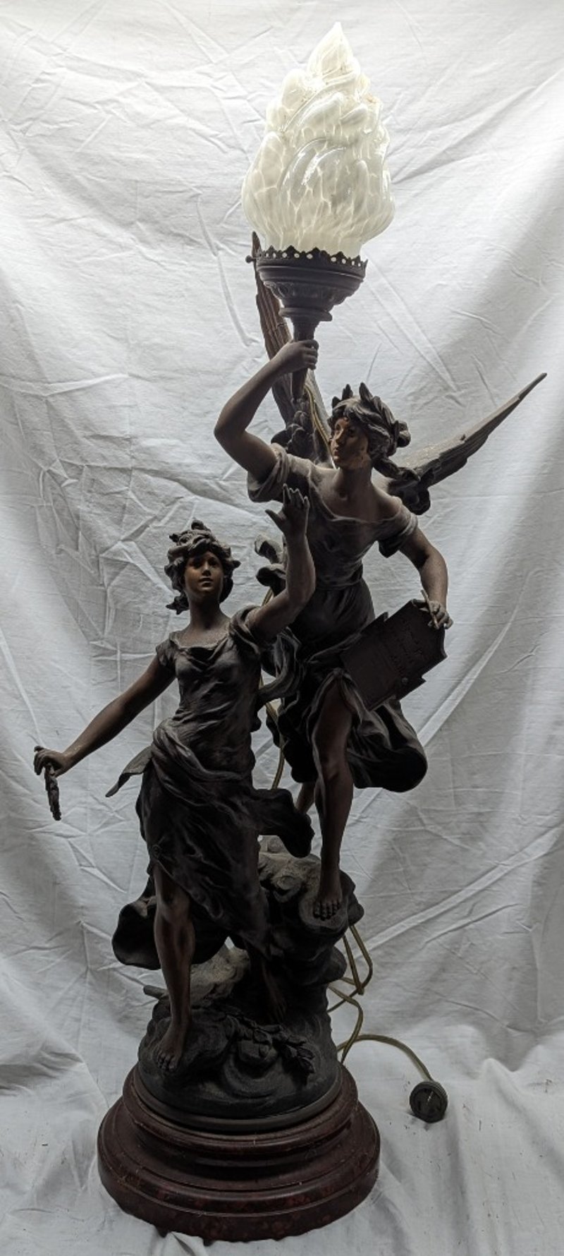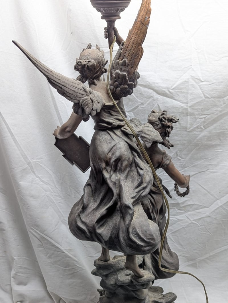 ELECTRIC DECORATIVE LAMPItem Size: Height: 104cm, Width: 45cm, Depth: 34cmMetal Construction, Item Features Winged Figure Holding Torch With Bulb Fitting With Lady Holding Laurel Reaching Upwards, Glass Bulb Cover In Shape Of Flame, Timber Base, Power CordItem Untested, Tip Of Wing Broken7A587717+2