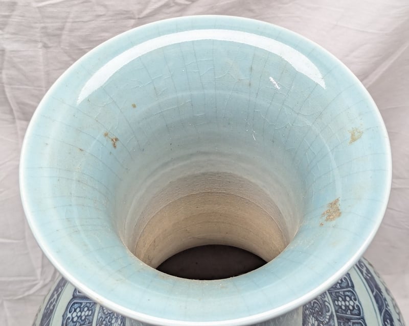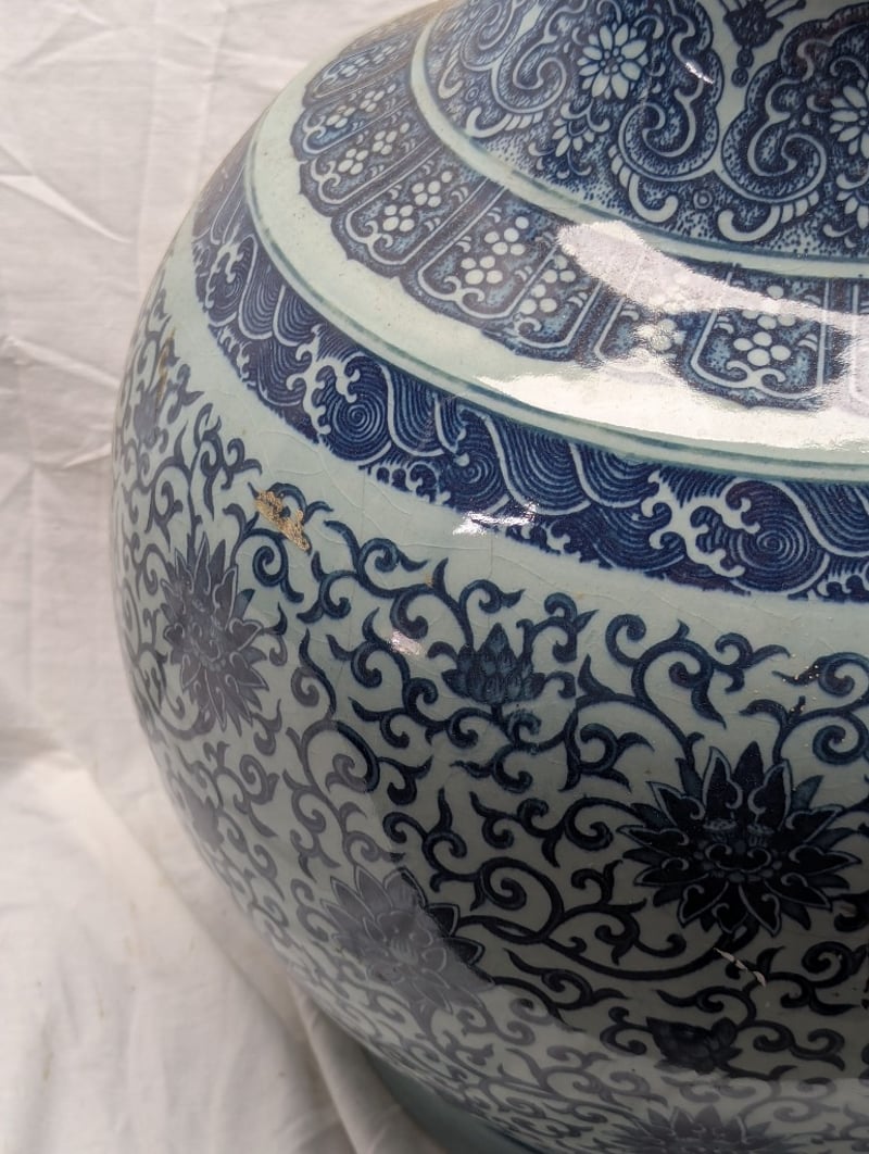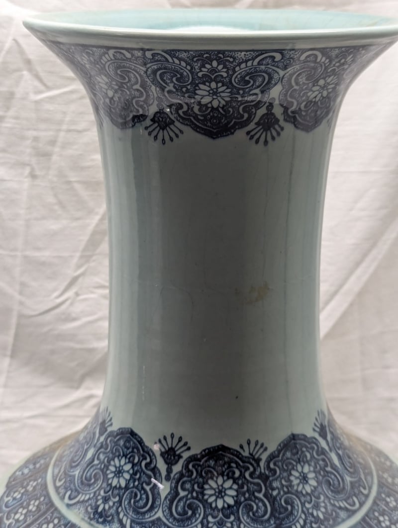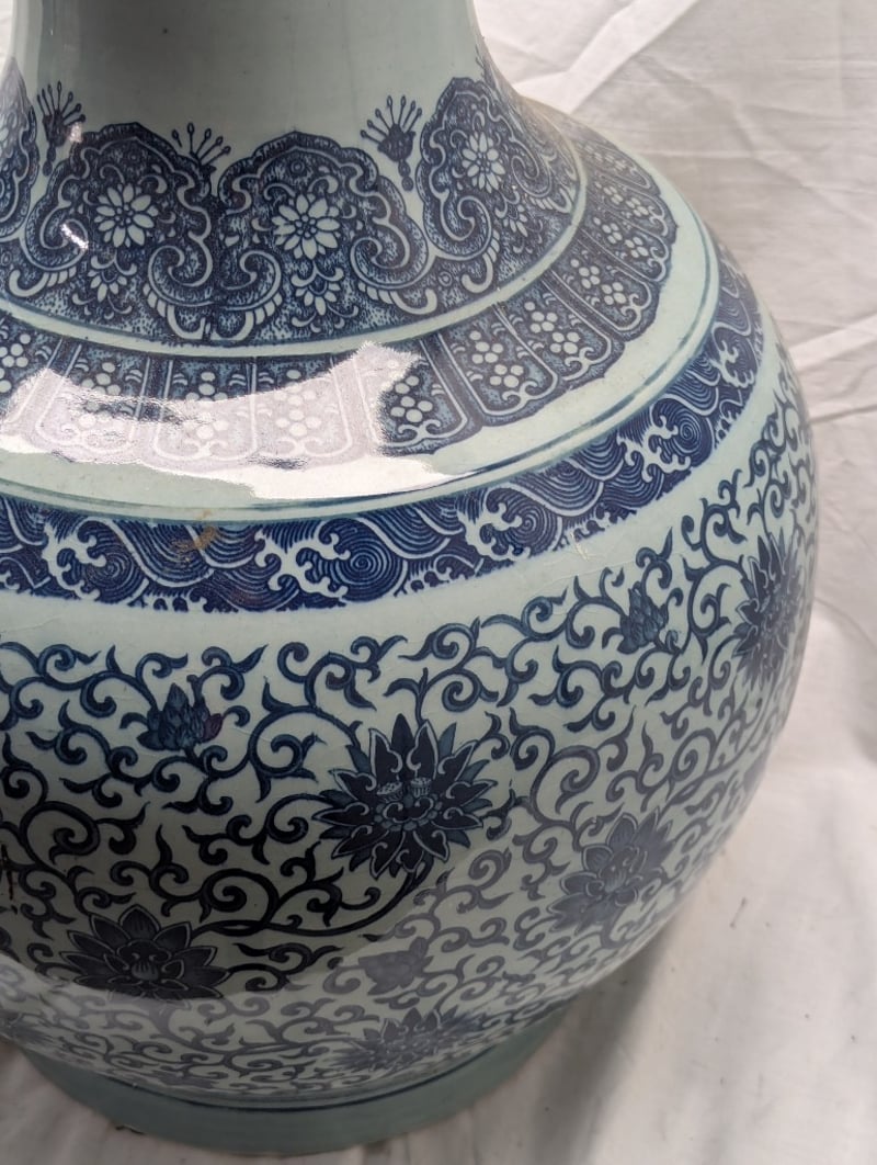 DECORATIVE CERAMIC VASEItem Size: Height: 63cm, Width: 37cm, Depth: 37cmVase Features Blue Colour With Ornate And Floral Style Design Around ExteriorCondition: Good - Refer To Images587717+3