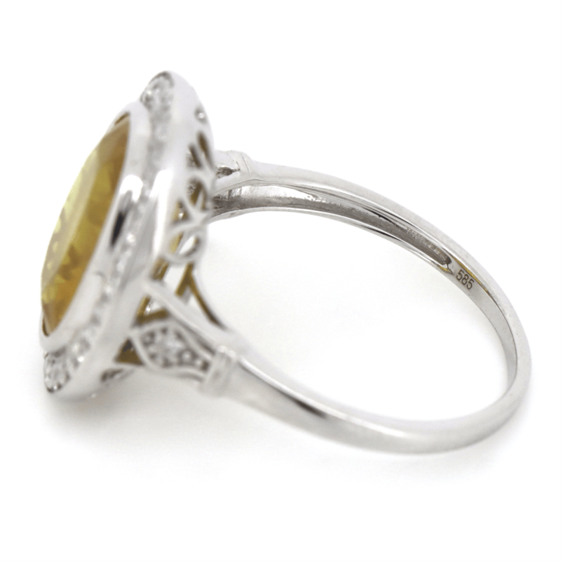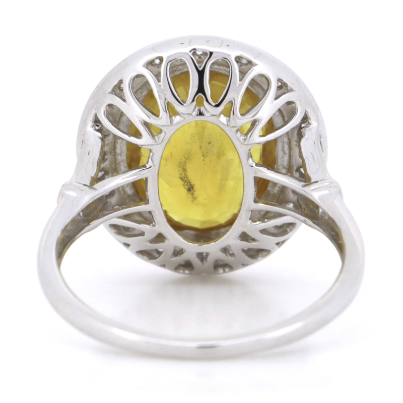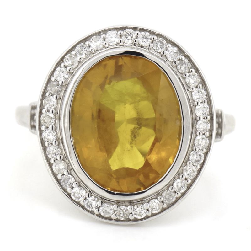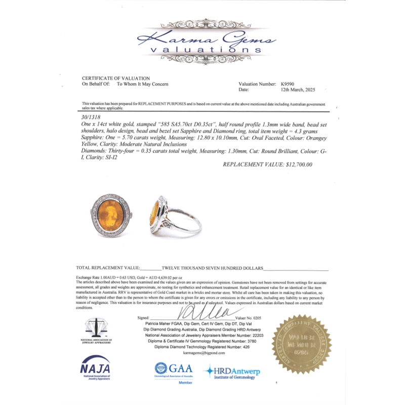 14K WHITE GOLD, YELLOW SAPPHIRE AND DIAMOND, HALO RING. The Centre Features, One Oval Cut, Orangey-Yellow, Sapphire (5.70Ct, Moderate Natural Inclusions), Bezel Set. Surrounding The Centre In A Halo And Decorating The Shoulders Are, 34 Round Brilliant Cut, Diamonds (0.35Ct Tdw, G-I Colour, Si-I2 Clarity), Bead Set. Ring Size N. Jewellery Valuations Provided By A Third Party Professional Not Directly Associated With Lloyds Auctions at AUD $$12,700.00This Insurance Valuation has been provided by a registered Jewellery Valuer and is intended for insurance purposes only. The valuation amount has no bearing on the auction value of the item. Any questions regarding the valuation should be directed to the issuing Valuer (refer to contact details on the certificate) as Lloyds have no association or relationship with the Valuer or the valuation amount contained within the valuation. Condition: NEW 0645882+76