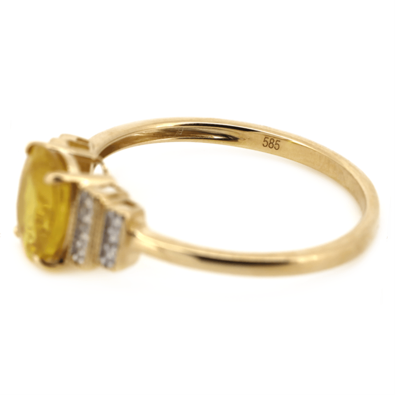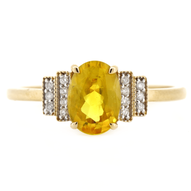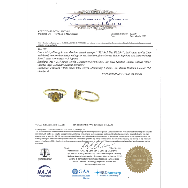 14K YELLOW GOLD, YELLOW SAPPHIRE AND DIAMOND, DRESS RING. The Centre Features, One Oval Cut, Golden Yellow, Sapphire (2.19Ct, Light-Moderate Natural Inclusions), Claw Set. Flanking The Centre Are, 14 Round Brilliant Cut, Diamonds (0.09Ct Tdw, H-J Colour, Si Clarity), Bead Set With Millegrain Detail. Ring Size N. Jewellery Valuations Provided By A Third Party Professional Not Directly Associated With Lloyds Auctions at AUD $$6,500.00This Insurance Valuation has been provided by a registered Jewellery Valuer and is intended for insurance purposes only. The valuation amount has no bearing on the auction value of the item. Any questions regarding the valuation should be directed to the issuing Valuer (refer to contact details on the certificate) as Lloyds have no association or relationship with the Valuer or the valuation amount contained within the valuation. Condition: NEW 0645882+33