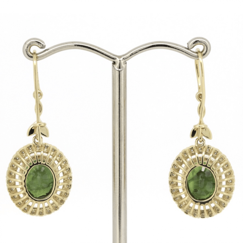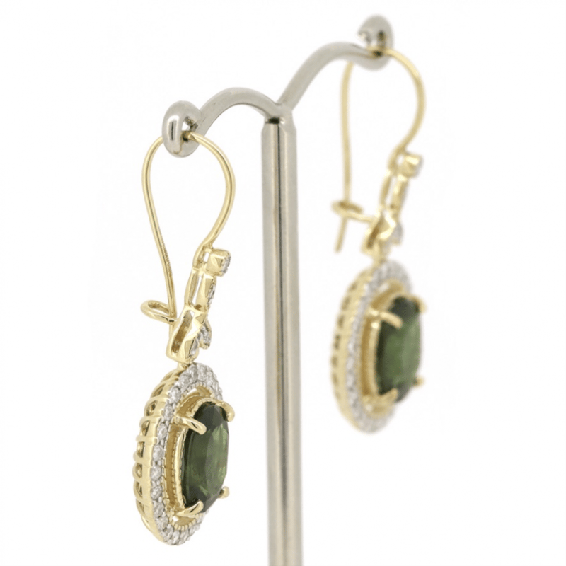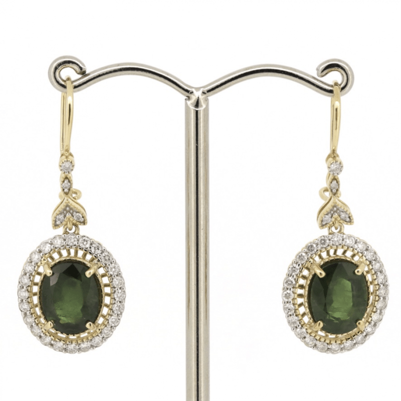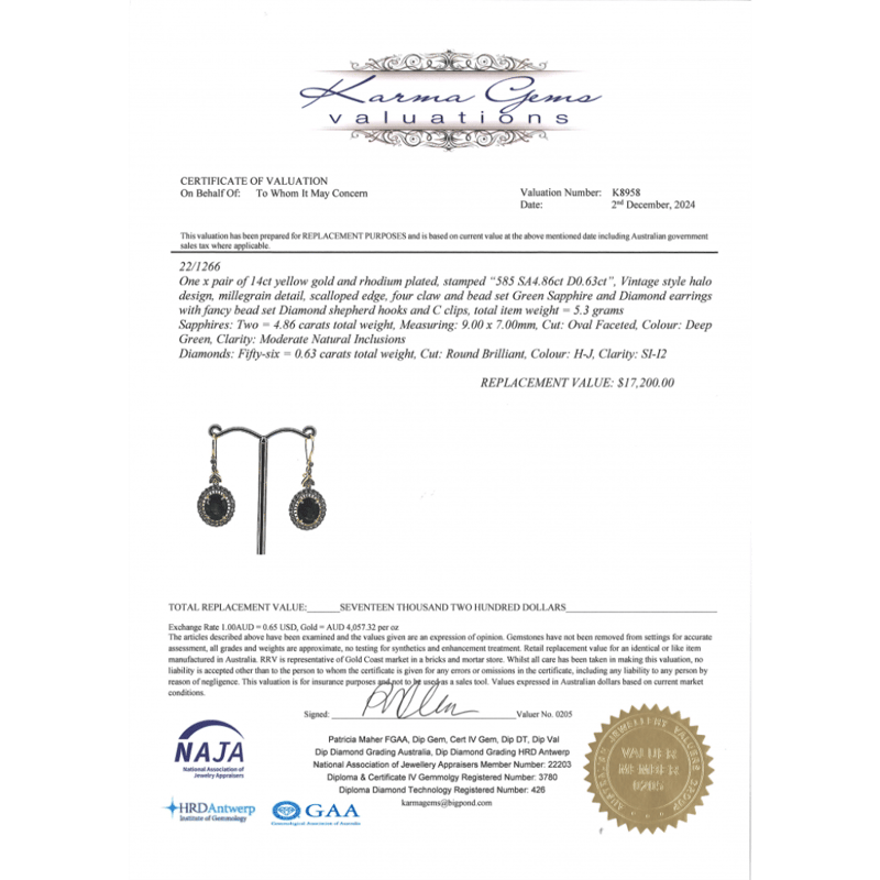 14K YELLOW GOLD, GREEN SAPPHIRE AND DIAMOND, HALO DROP EARRINGS. The Earrings Feature, 2 Oval Cut, Deep Green, Sapphires (4.86Ct Tsw, Included), 4 Claw Set. Surrounding The Sapphires In Halos And Decorating The Hooks/Joins Are, 56 Round Brilliant Cut, Diamonds (0.63Ct Tdw, H-J Colour, Si-I2 Clarity), Bezel/Bead Set In White Gold With Millegrain Detail. The Earrings Have Shepherds Hooks With 'C' Hook Closures. Jewellery Valuations Provided By A Third Party Professional Not Directly Associated With Lloyds Auctions at AUD $$17,200.00This Insurance Valuation has been provided by a registered Jewellery Valuer and is intended for insurance purposes only. The valuation amount has no bearing on the auction value of the item. Any questions regarding the valuation should be directed to the issuing Valuer (refer to contact details on the certificate) as Lloyds have no association or relationship with the Valuer or the valuation amount contained within the valuation. Condition: NEW 0645882+73