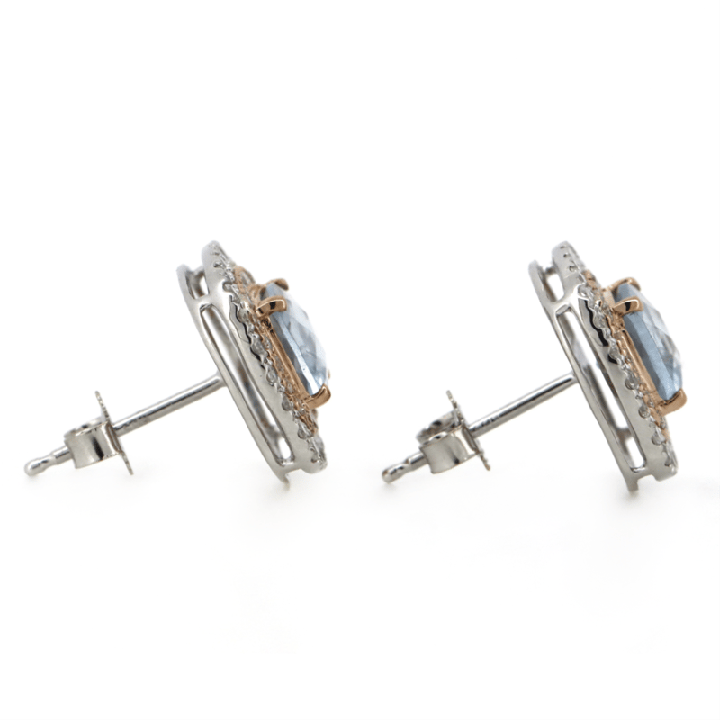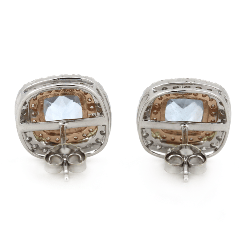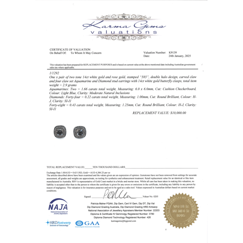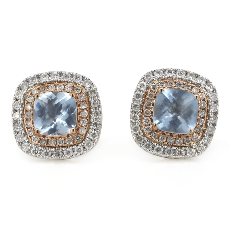 14K ROSE/WHITE GOLD, AQUAMARINE AND DIAMOND, DOUBLE HALO STUD EARRINGS. The Centres Feature, 2 Cushion Checkerboard Cut, Light Blue, Aquamarines (1.66Ct Tsw, Moderate Natural Inclusions), Claw Set. Surrounding The Centres In The Innermost Halos Are, 44 Round Brilliant Cut, Diamonds (0.22Ct Tdw, H-J Colour, Si-I1 Clarity), 4 Claw Set. Surrounding The Centres In The Outermost Halos Are, 48 Round Brilliant Cut, Diamonds (0.43Ct Tdw, H-J Colour, Si-I1 Clarity), 4 Claw Set. The Earrings Feature 14K White Gold Posts And Butterfly Clasps. Jewellery Valuations Provided By A Third Party Professional Not Directly Associated With Lloyds Auctions at AUD $$10,000.00This Insurance Valuation has been provided by a registered Jewellery Valuer and is intended for insurance purposes only. The valuation amount has no bearing on the auction value of the item. Any questions regarding the valuation should be directed to the issuing Valuer (refer to contact details on the certificate) as Lloyds have no association or relationship with the Valuer or the valuation amount contained within the valuation. Condition: NEW 0645882+97
