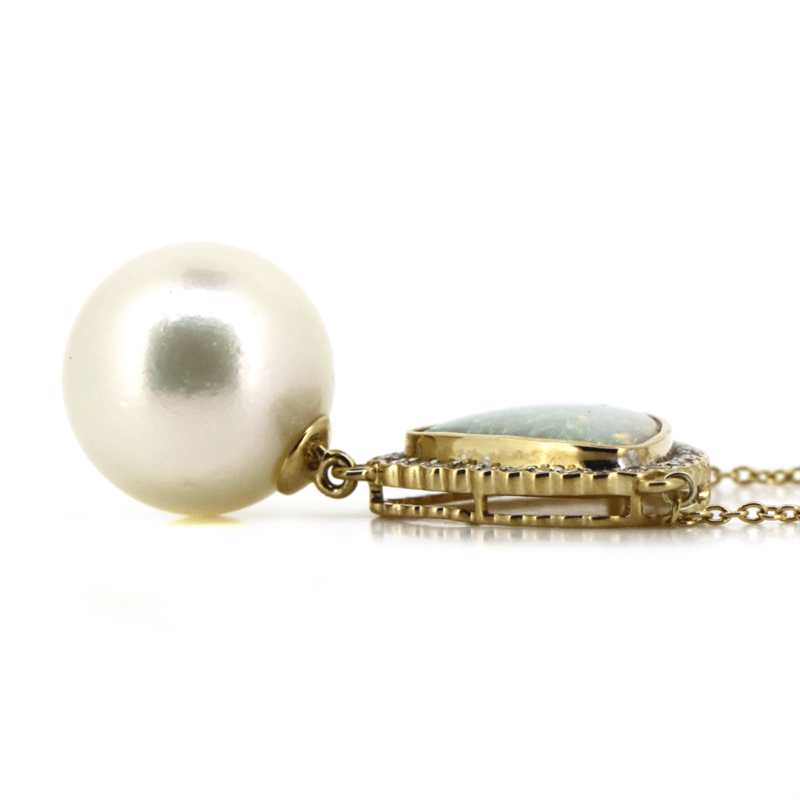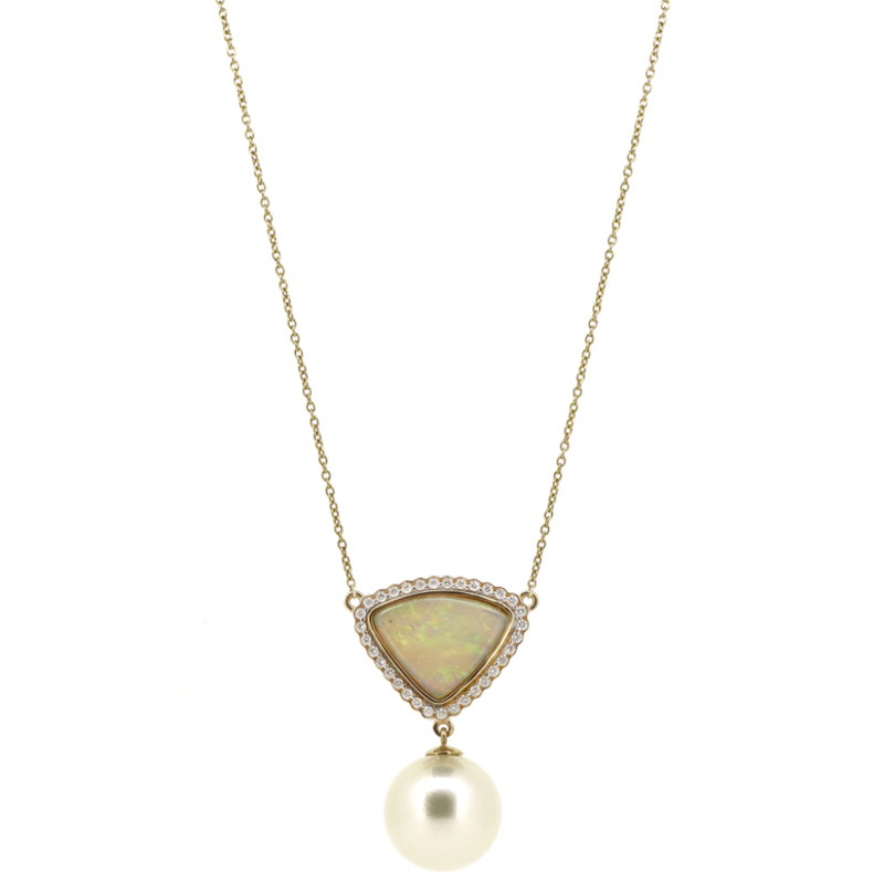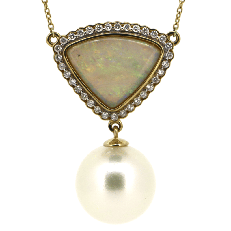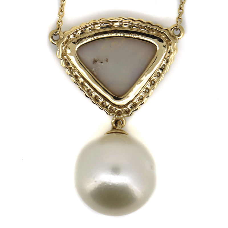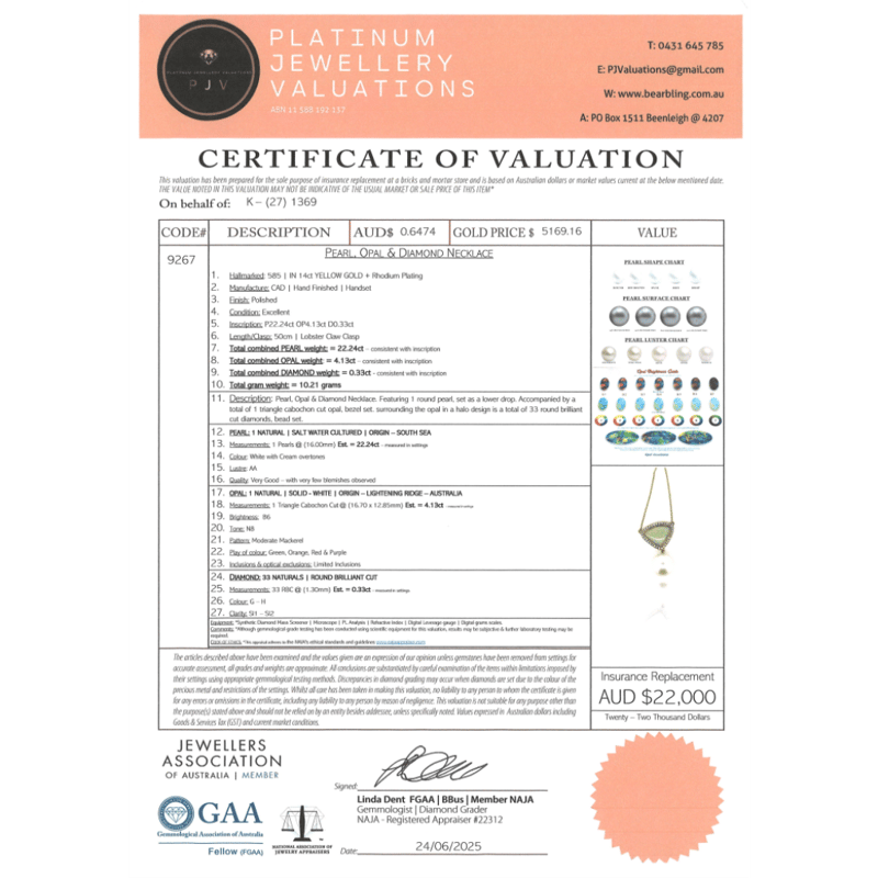 14K YELLOW GOLD, WHITE CULTURED SOUTH SEA PEARL, 4.13CT AUSTRALIAN LIGHTNING RIDGE OPAL AND DIAMOND, NECKLACE. The Design Features, One Round, White With Cream Overtones, Cultured South Sea Pearl (16.00Mm Size, Aa Lustre, Very Few Blemishes), Post Set As The Lower Drop. Surmounted By, One Triangular Cabochon Cut, Lightning Ridge Opal (4.13Ct, Green, Orange, Red, Purple Colour Play, Limited Inclusions), Bezel Set. Surrounding The Opal In A Halo Are, 33 Round Brilliant Cut, Diamonds (0.33Ct Tdw, G-H Colour, Si1-Si2 Clarity), Bead Set. The Necklace Has A Lobster Claw Clasp. Necklace Length Is 50Cm. Jewellery Valuations Provided By A Third Party Professional Not Directly Associated With Lloyds Auctions at AUD $$22,000.00This Insurance Valuation has been provided by a registered Jewellery Valuer and is intended for insurance purposes only. The valuation amount has no bearing on the auction value of the item. Any questions regarding the valuation should be directed to the issuing Valuer (refer to contact details on the certificate) as Lloyds have no association or relationship with the Valuer or the valuation amount contained within the valuation. Condition: NEW 0645882+88