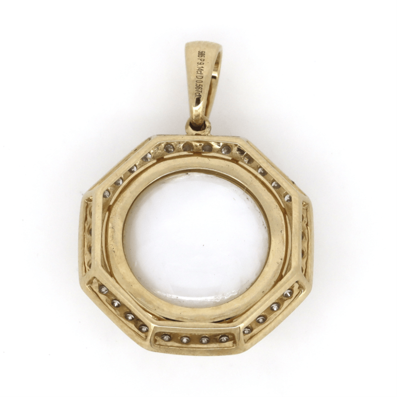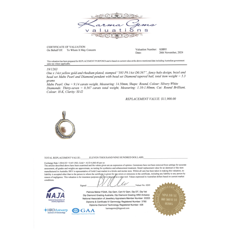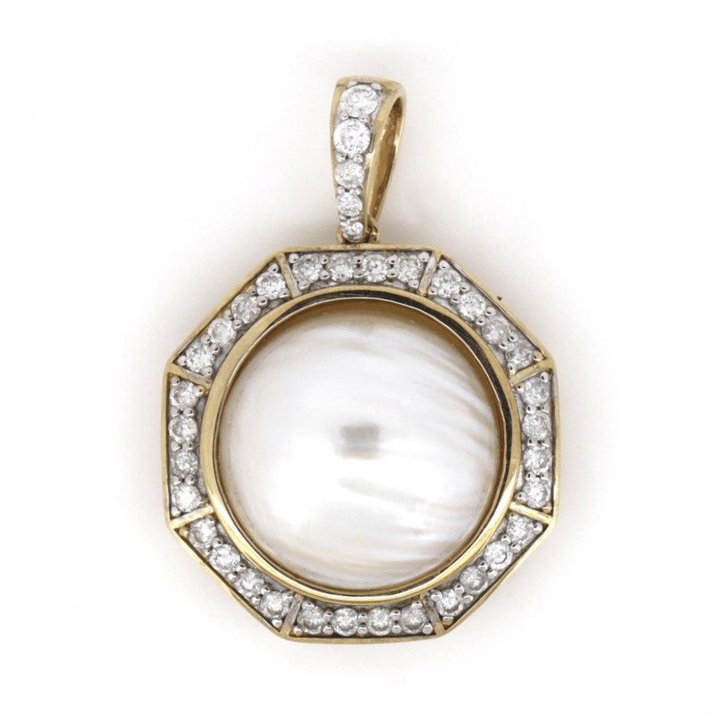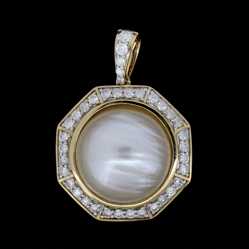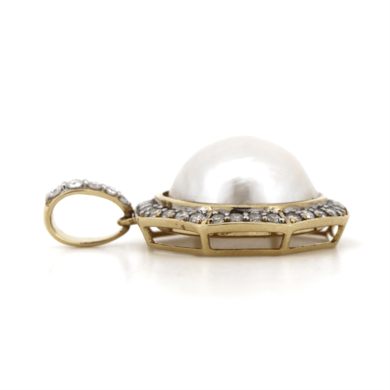 14K YELLOW GOLD, WHITE CULTURED MABE PEARL AND DIAMOND, PENDANT. The Centre Features, One Round, Silvery White, Cultured Mabe Pearl (9.14Ct, 14.50Mm), Bead Set. Encompassing The Centre Are, 37 Round Brilliant Cut, Diamonds (0.567Ct, H-K Colour, Si-I2 Clarity), Claw Set. Jewellery Valuations Provided By A Third Party Professional Not Directly Associated With Lloyds Auctions at AUD $$11,900.00This Insurance Valuation has been provided by a registered Jewellery Valuer and is intended for insurance purposes only. The valuation amount has no bearing on the auction value of the item. Any questions regarding the valuation should be directed to the issuing Valuer (refer to contact details on the certificate) as Lloyds have no association or relationship with the Valuer or the valuation amount contained within the valuation. Condition: NEW 0645882+45