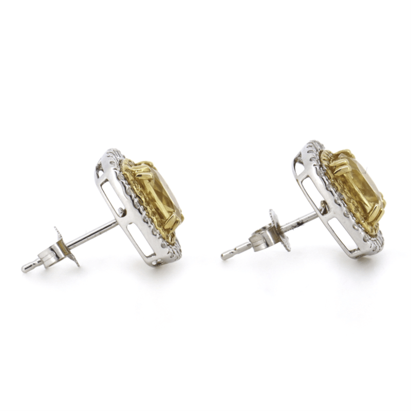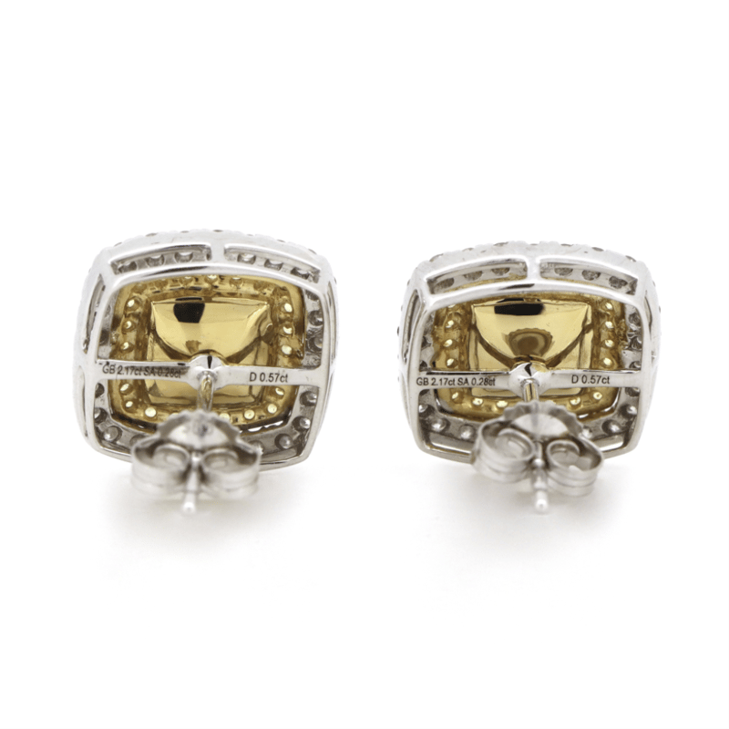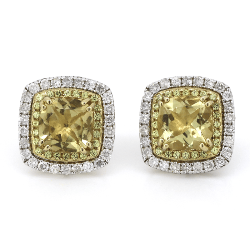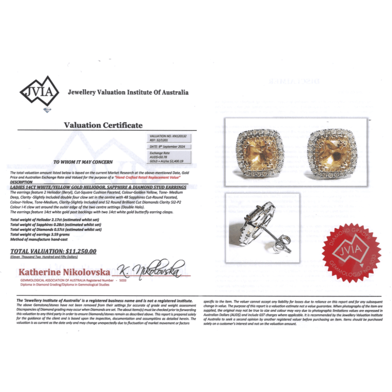 14K WHITE/YELLOW, HELIODOR, YELLOW SAPPHIRE AND DIAMOND, DOUBLE HALO STUD EARRINGS. The Centres Feature, 2 Square Cushion Faceted Cut, Medium Deep Golden Yellow, Heliodors (2.17Ct Tsw, Slightly Included), Double 4 Claw Set. Surrounding The Centre In The Innermost Halo Are, 48 Round Faceted Cut, Medium Yellow, Sapphires (0.28Ct Tsw, Slightly Included), Claw Set. Surrounding The Centre In The Outermost Halo Are, 52 Round Brilliant Cut, Diamonds (0.57Ct Tdw, I-K Colour, Si2-P2 Clarity), Claw Set. The Earrings Feature Post Backs With 14K White Gold Butterfly Clasps. Jewellery Valuations Provided By A Third Party Professional Not Directly Associated With Lloyds Auctions at AUD $$11,250.00This Insurance Valuation has been provided by a registered Jewellery Valuer and is intended for insurance purposes only. The valuation amount has no bearing on the auction value of the item. Any questions regarding the valuation should be directed to the issuing Valuer (refer to contact details on the certificate) as Lloyds have no association or relationship with the Valuer or the valuation amount contained within the valuation. Condition: NEW 0645882+87