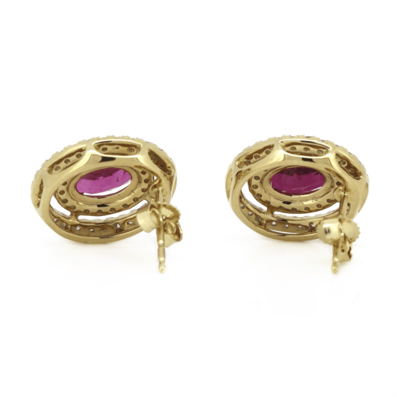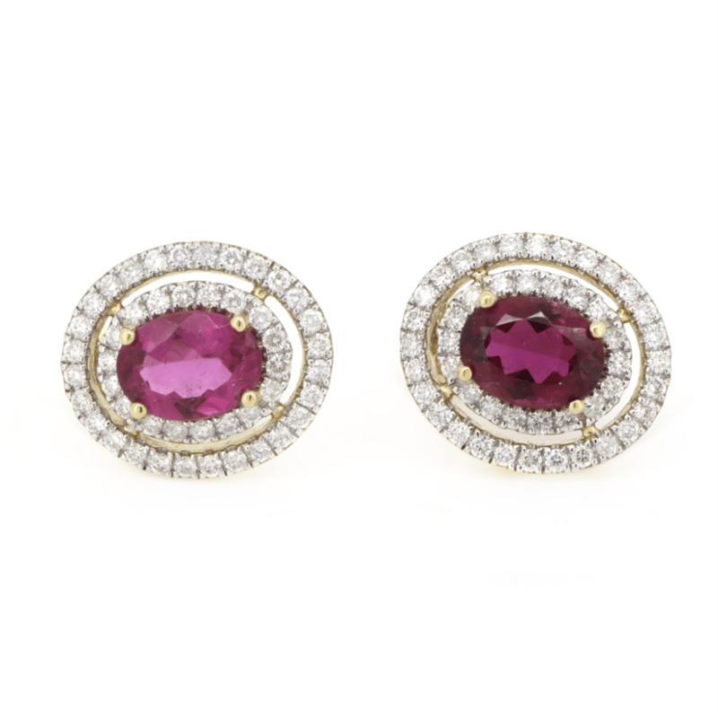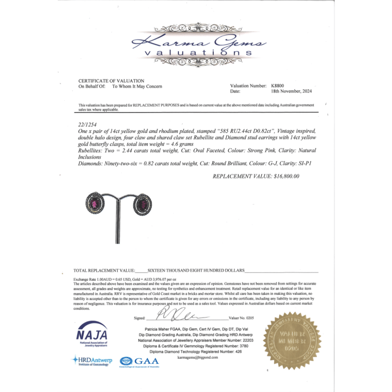 14K YELLOW GOLD, RUBELLITE AND DIAMOND, DOUBLE HALO STUD EARRINGS. The Centres Feature, 2 Oval Faceted Cut, Strong Pink, Rubellite (2.44Ct Tsw, Natural Inclusions), 4 Claw Set. Surrounding The Centres In Double Halos Are, 92 Round Brilliant Cut, Diamonds (0.82Ct Tdw, G-J Colour, Si-P1 Clarity), Claw Set. The Earrings Have Post Backs, With 14K Yellow Gold Butterfly Clasps. Jewellery Valuations Provided By A Third Party Professional Not Directly Associated With Lloyds Auctions at AUD $$16,800.00This Insurance Valuation has been provided by a registered Jewellery Valuer and is intended for insurance purposes only. The valuation amount has no bearing on the auction value of the item. Any questions regarding the valuation should be directed to the issuing Valuer (refer to contact details on the certificate) as Lloyds have no association or relationship with the Valuer or the valuation amount contained within the valuation. Condition: NEW 0645882+54