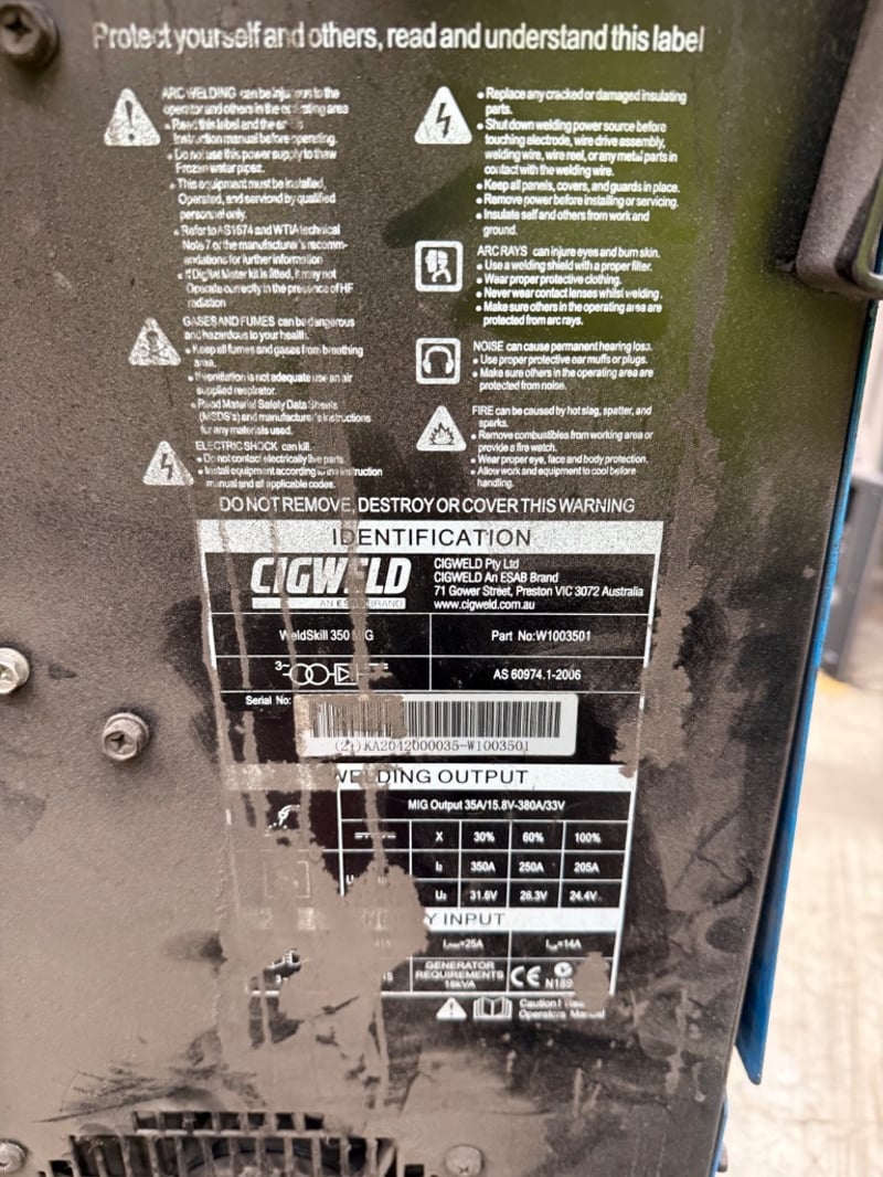 Welding equipment, Cigweld WeldSkill 350 Mig Welder, SN-KA2042000035-W1003501, including some connectionsQuantity-1