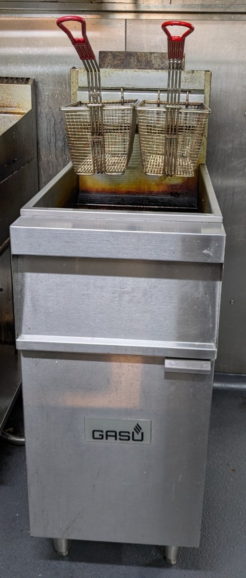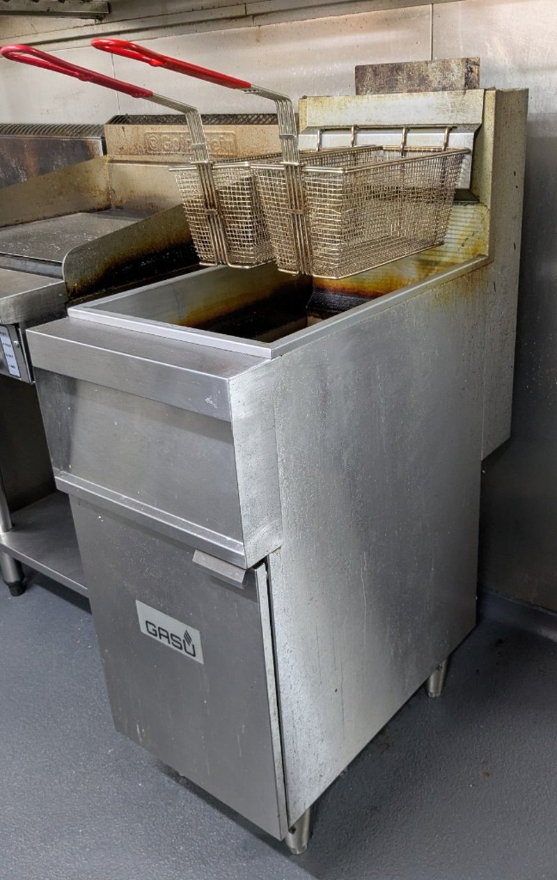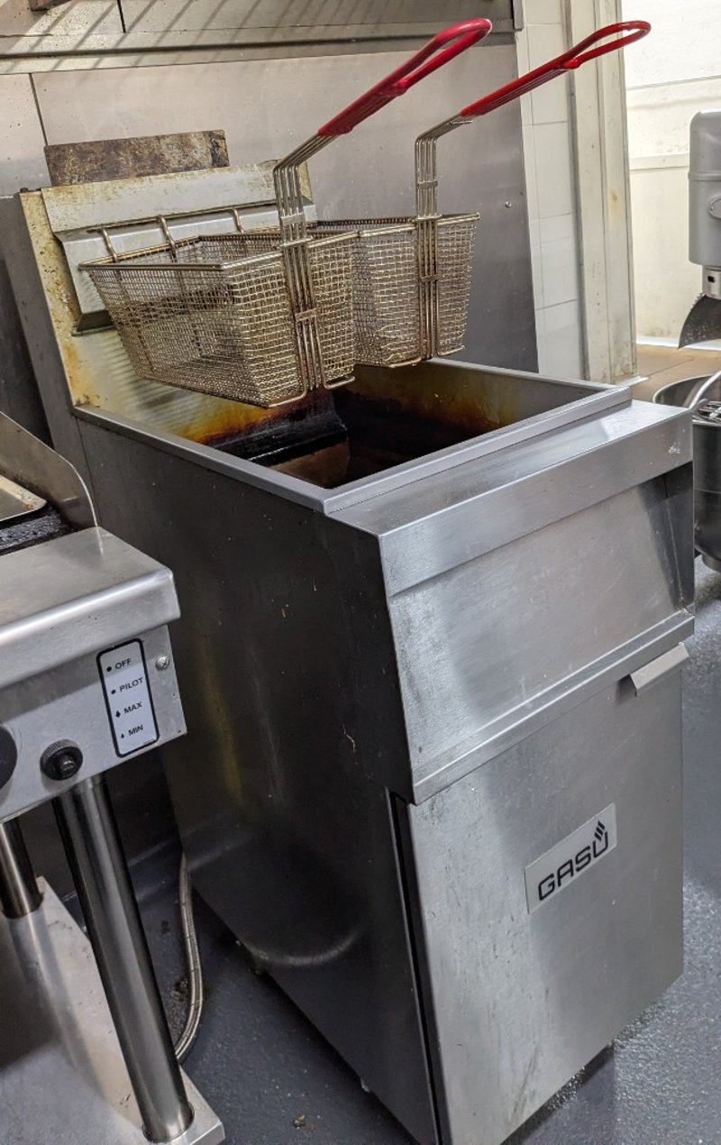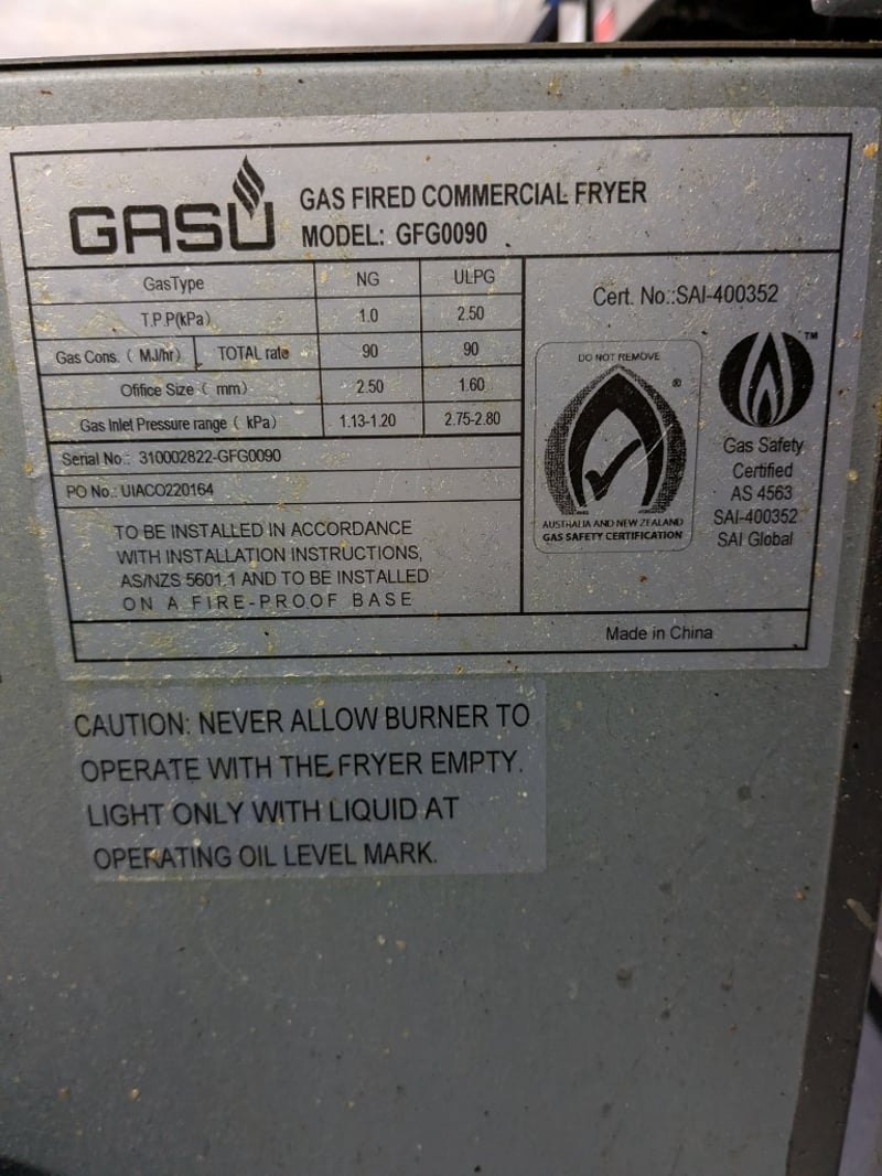 Stainless steel GASU Gas fired commercial fryer.Model number: GFG0090Serial number: UIACO220164Dims: H:126 cm, W:76 cm, L:40 cmNOTE: Signs of wear and tear, refer to the photos, item untested.