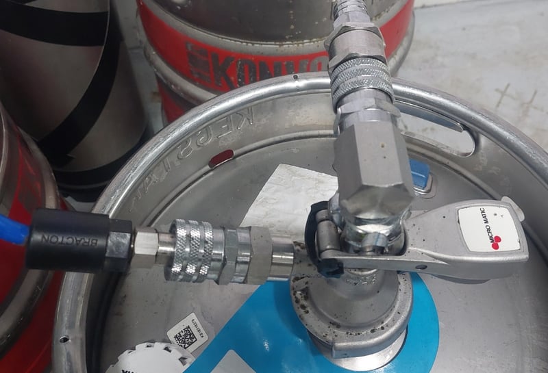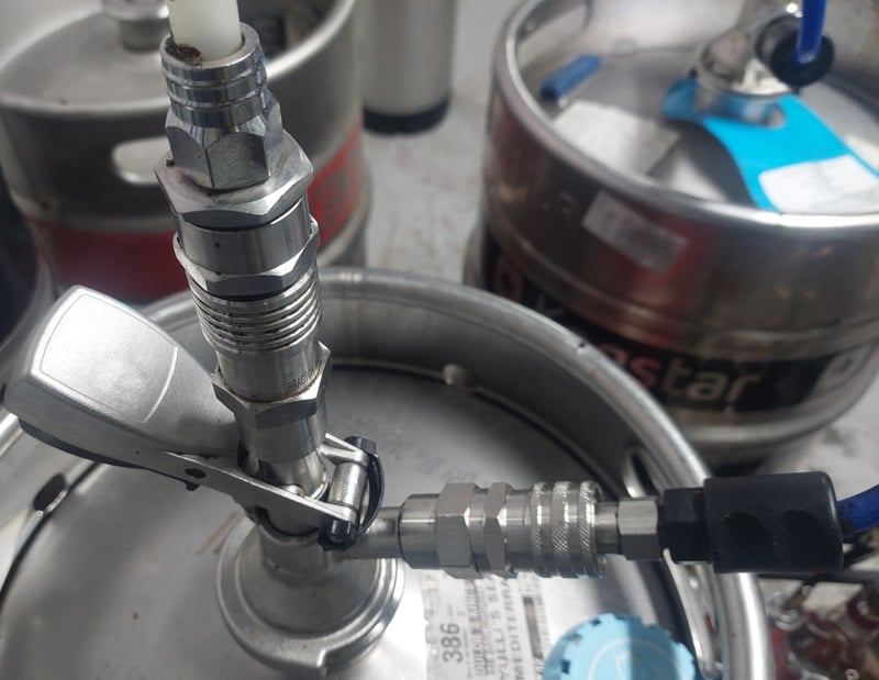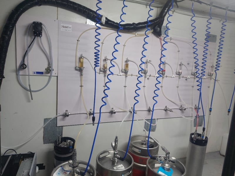 Full setup with beer lines, fittings, pumps, and inspection windows in the cool room