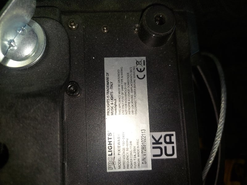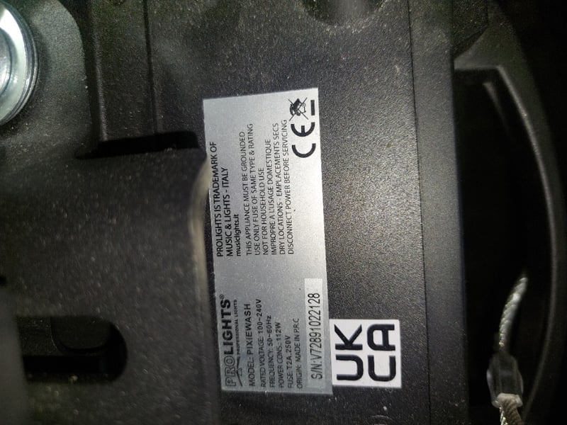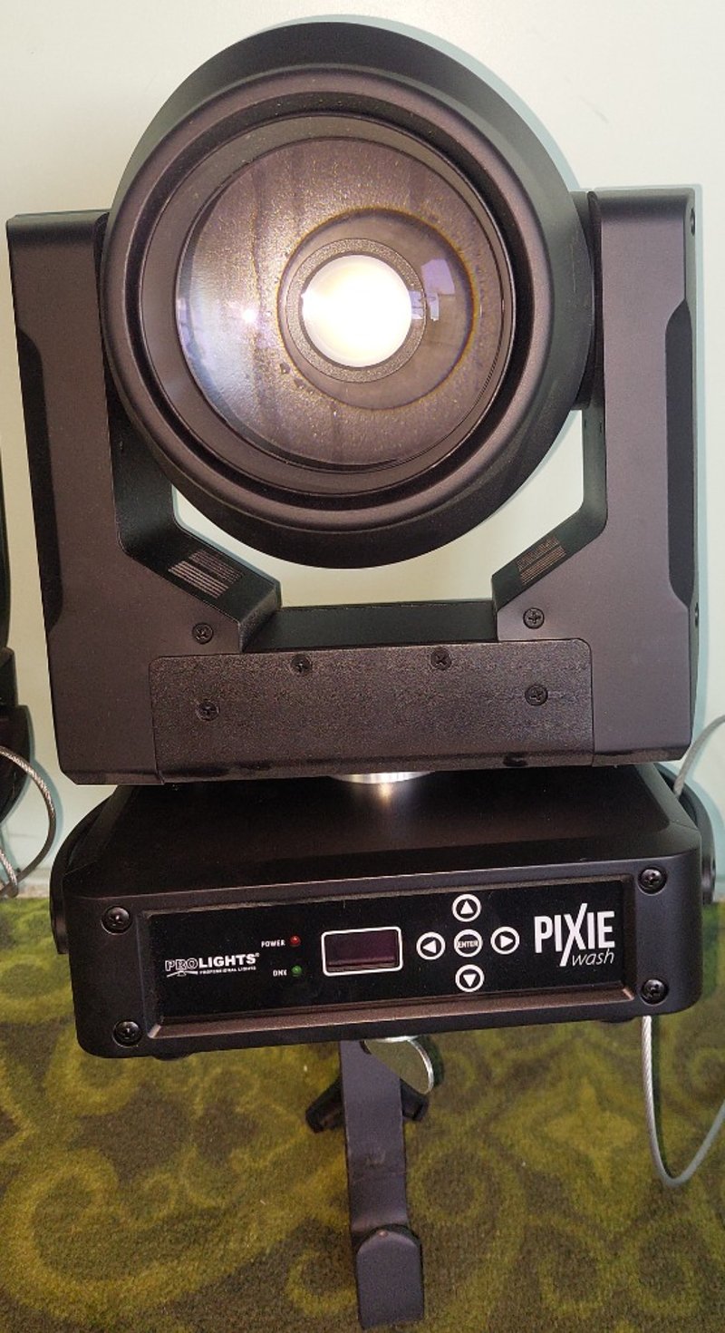 Prolights Pixie Wash, a professional moving head stage lighting fixture. Qty: 2 per lot.Serial number: V72891022128, V72891022113Sold as a lot.Note: items are untested, signs of wear.
