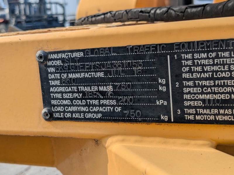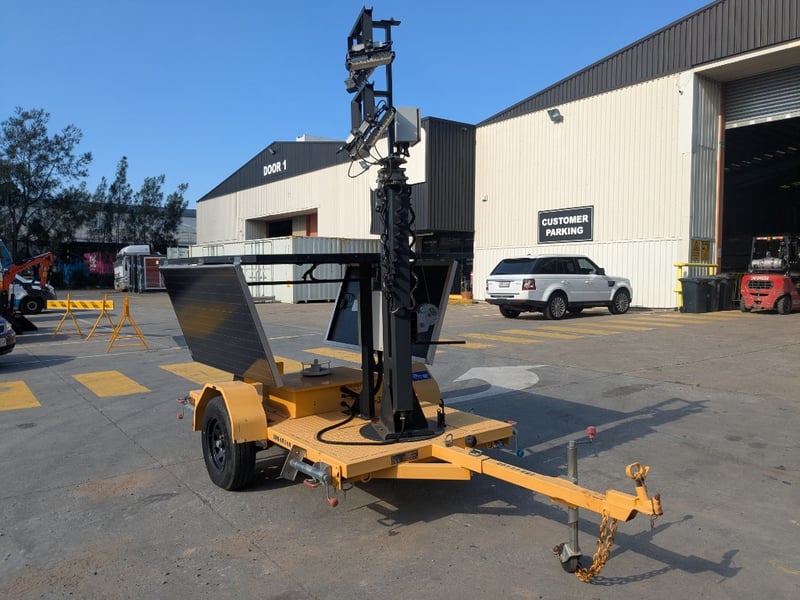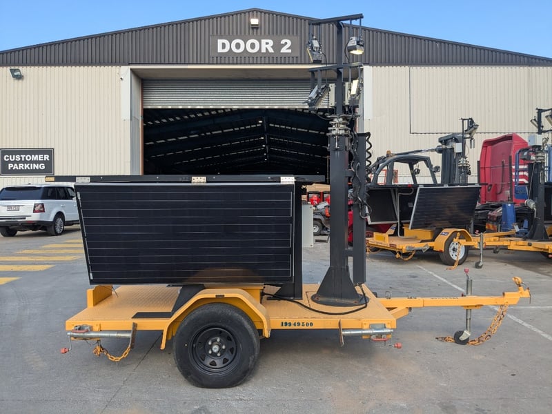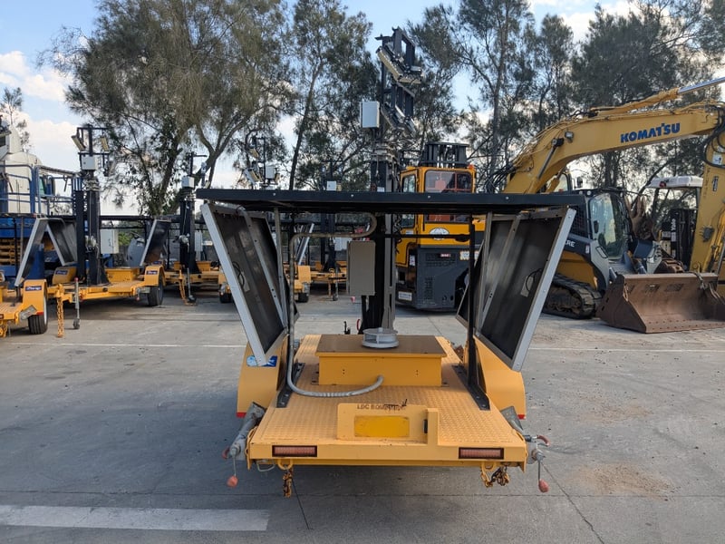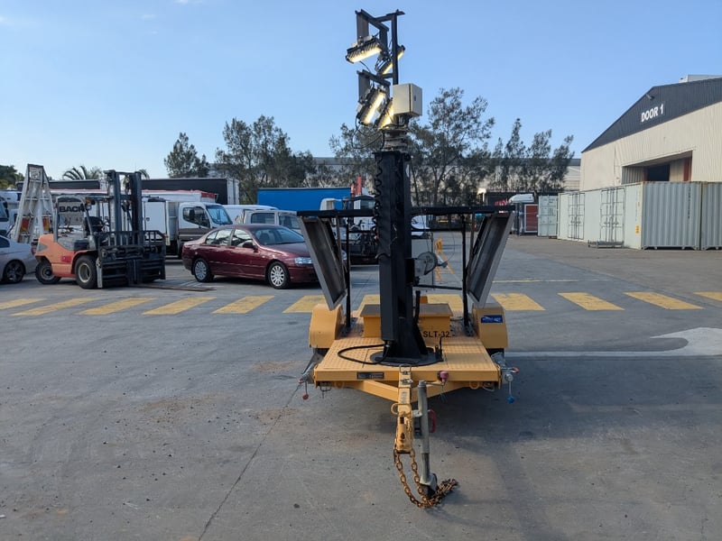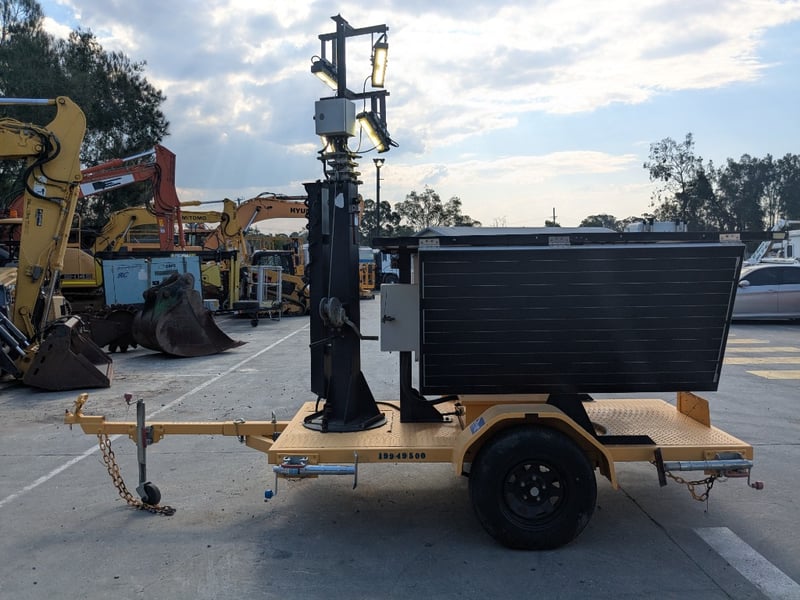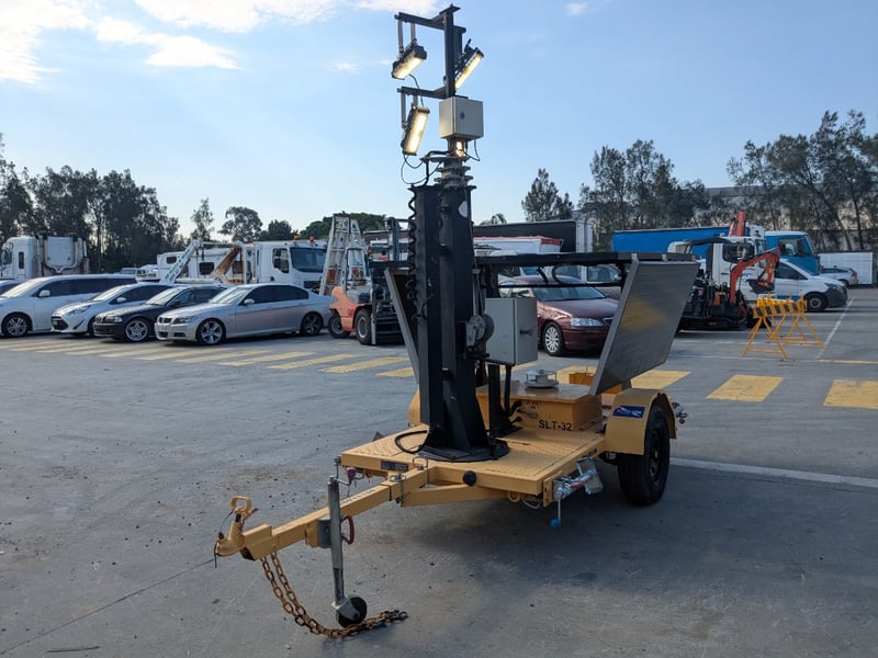 Description: Jockey Wheel, stabilising legs, telescopic light tower, 2 light sections, fuse box, light tower height from ground up 7.1mts approximately, trailer length 3mts, 1.3mts wide approximately,.