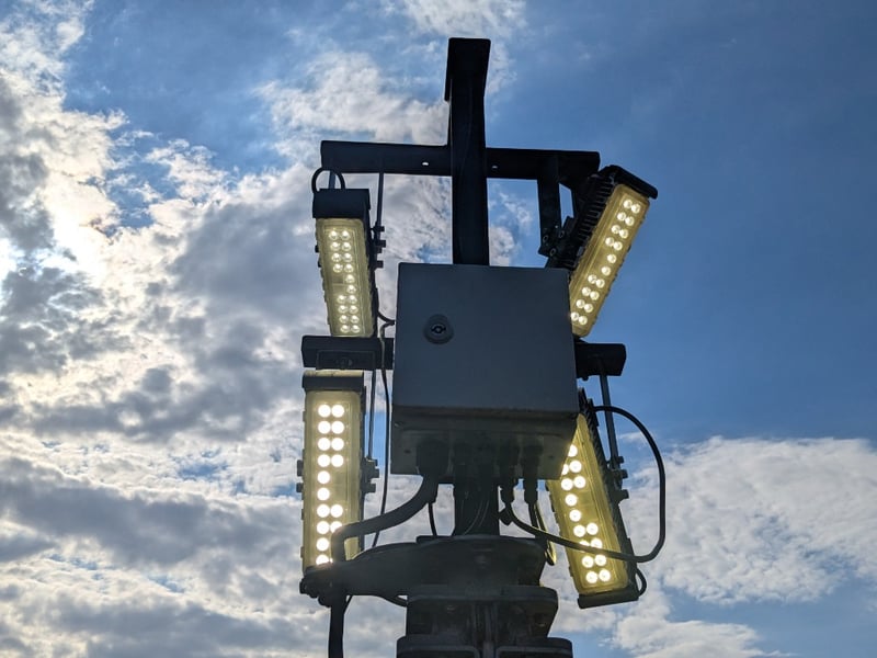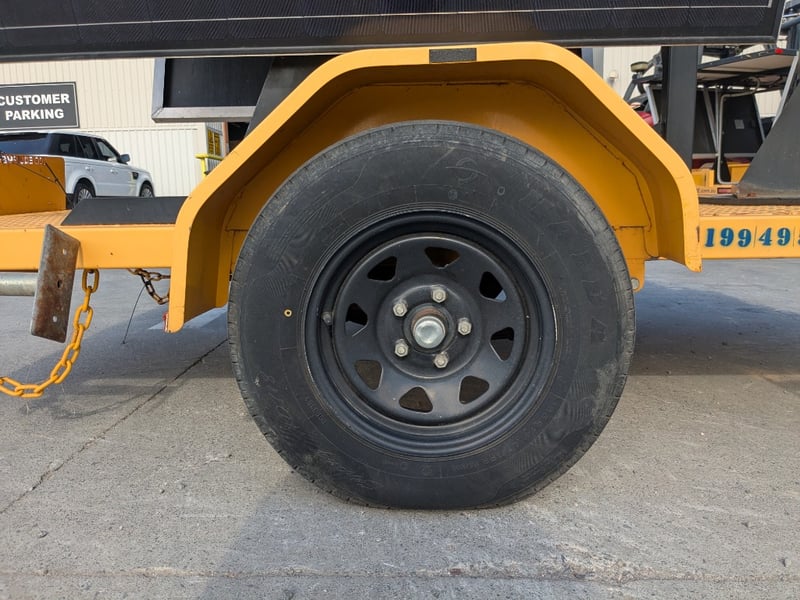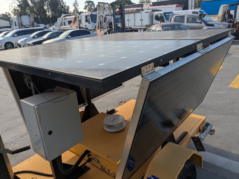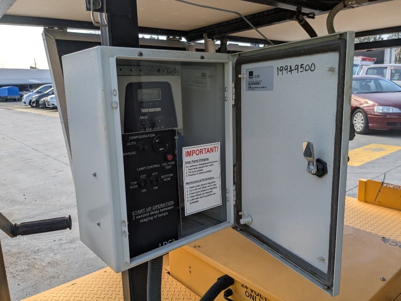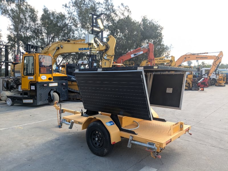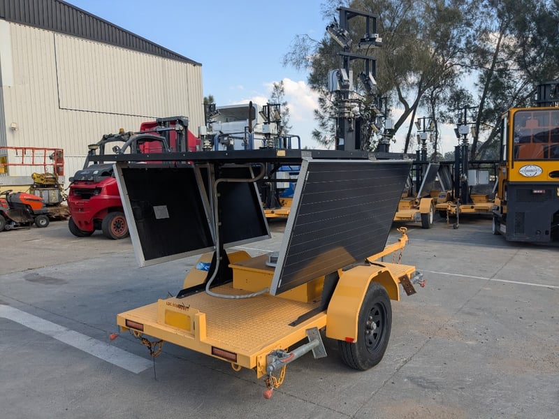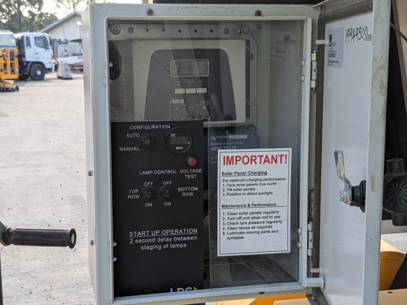 Description: Jockey Wheel, stabilising legs, telescopic light tower, 2 light sections, fuse box, light tower height from ground up 7.1mts approximately, trailer length 3mts, 1.3mts wide approximately,.