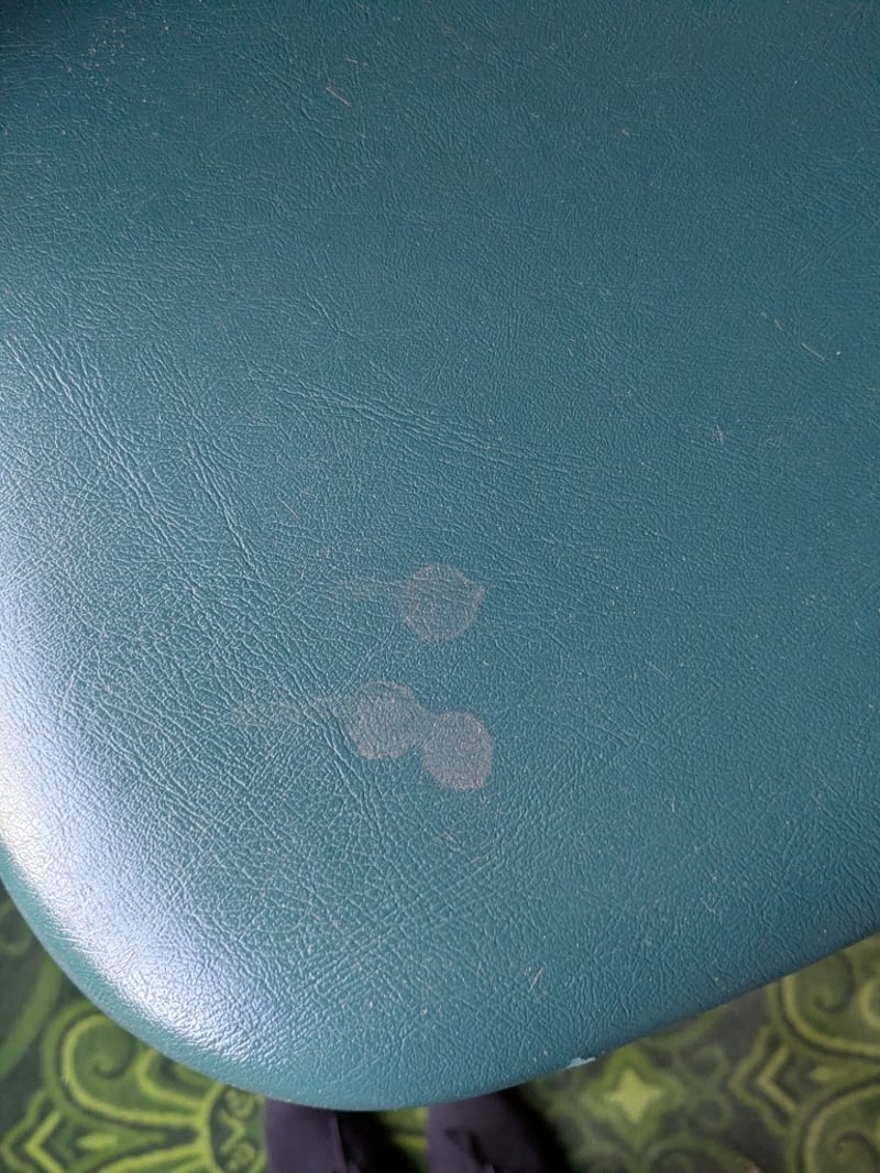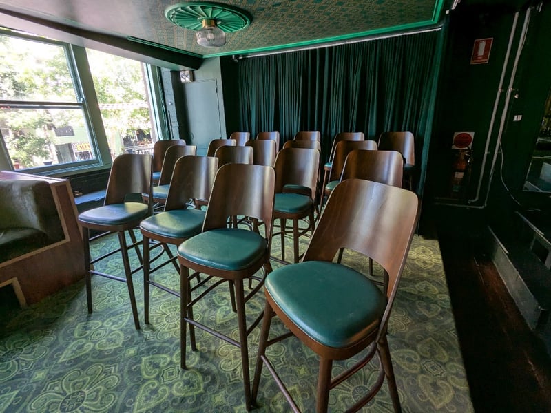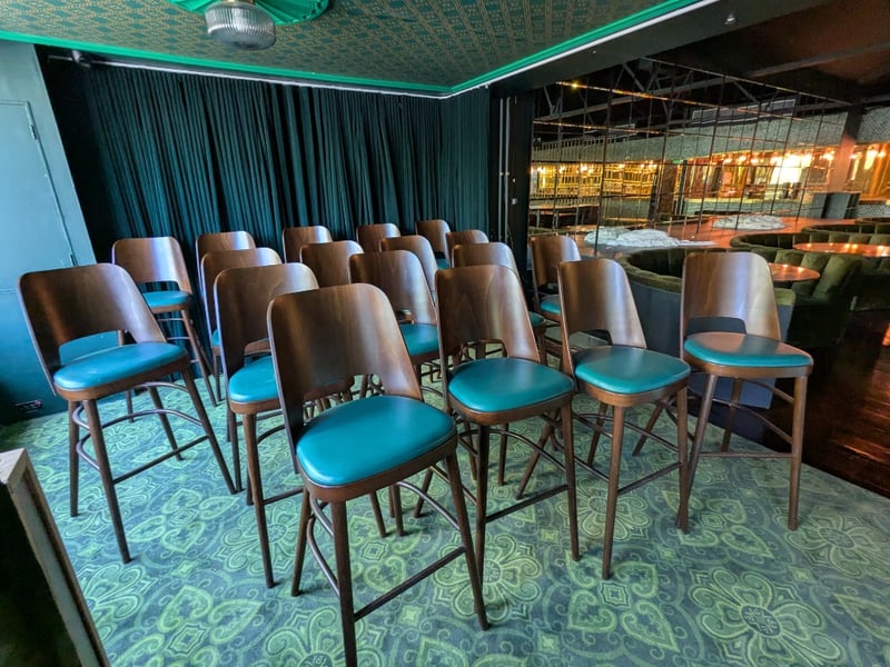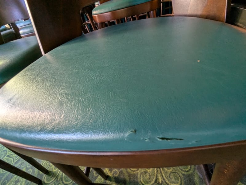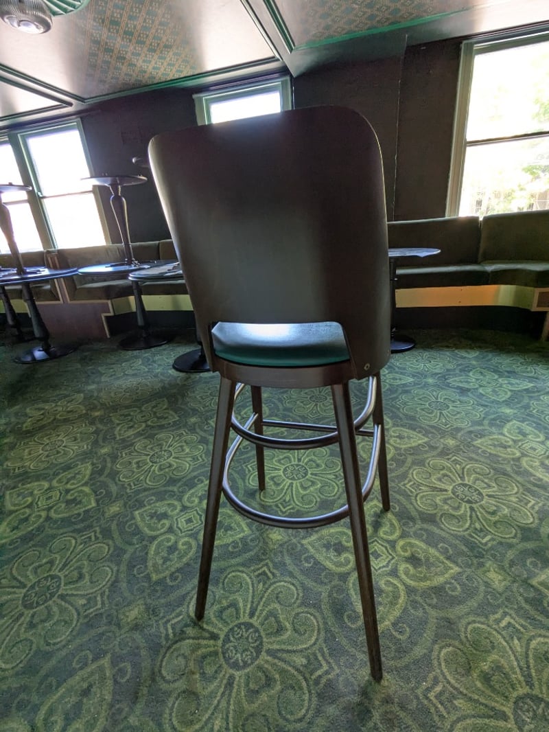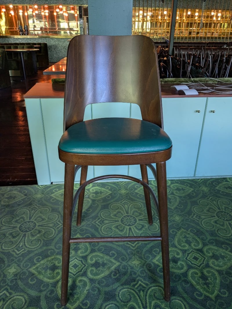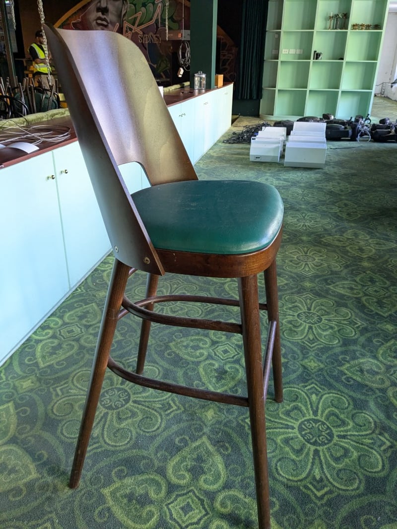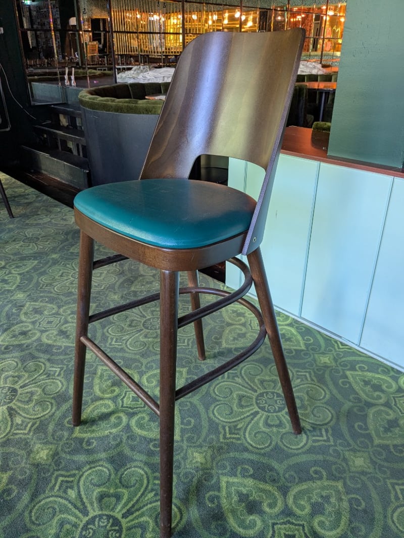 Barstool with a dark oak frame and a green upholstered seat. Dims per chair: H:112 cm, L:45 cm, W: 45 cm QTY: 18 per lot Sold as a lot. NOTE: Signs of wear and tear.