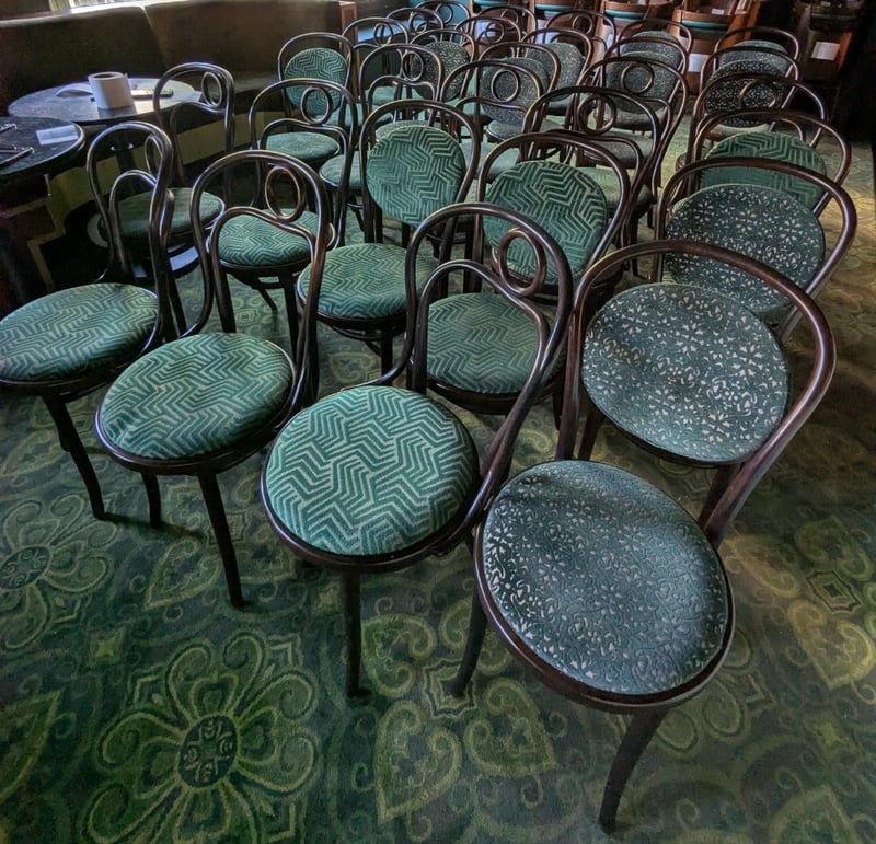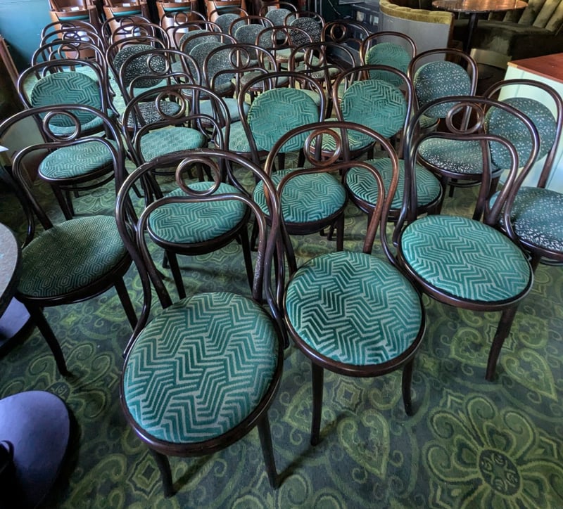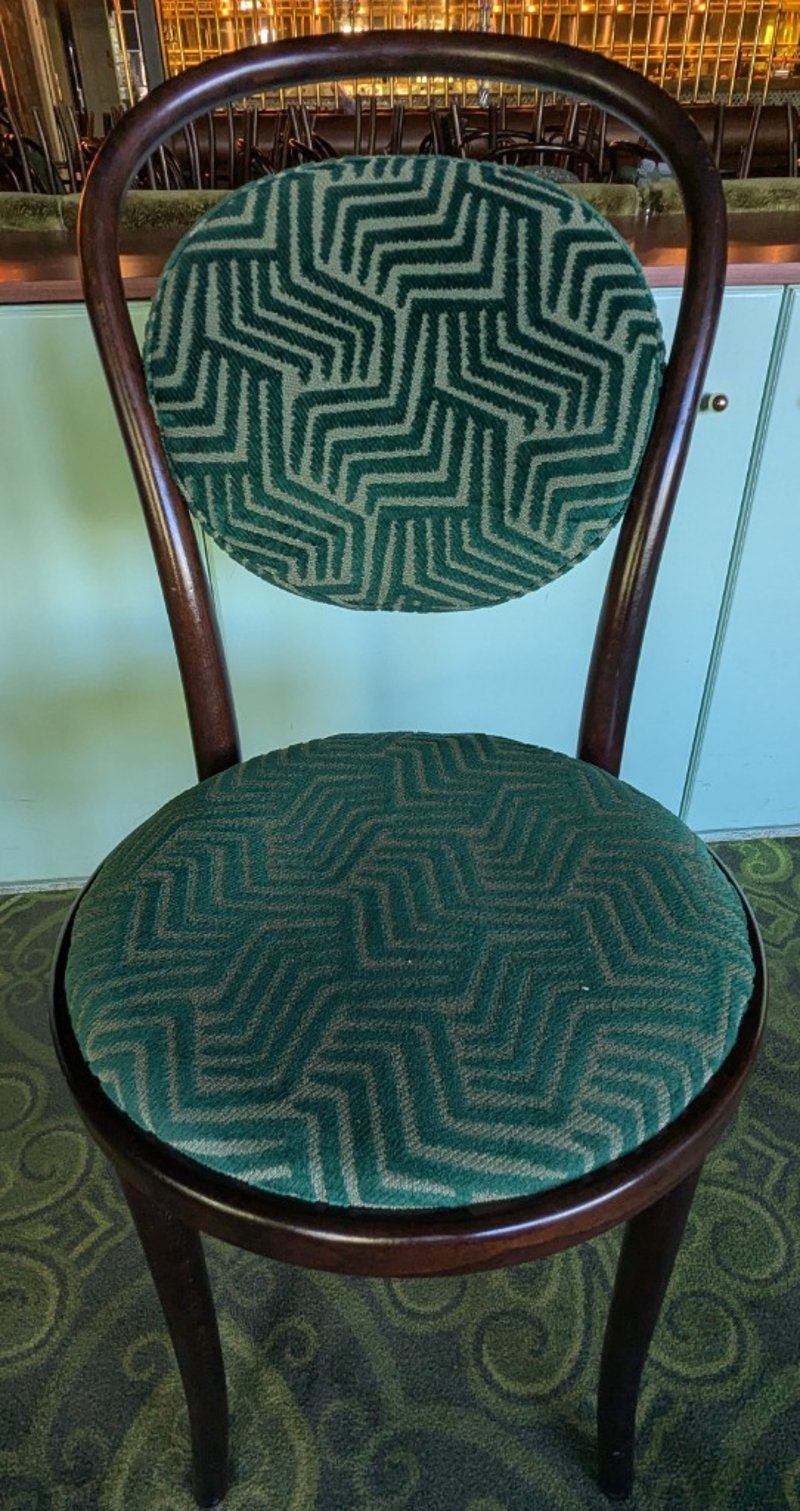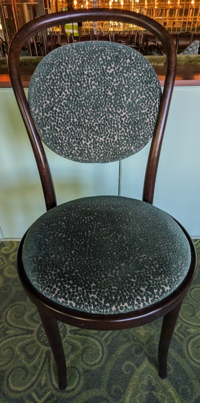 Assorted dinning chairs with a dark oak finish and an upholstered green geometric pattern seat pad. Dims per chair: H:90 cm, L:25 cm, W:42 cm QTY: 29 per lot. NOTE: Signs of wear and tear. Sold as a lot.