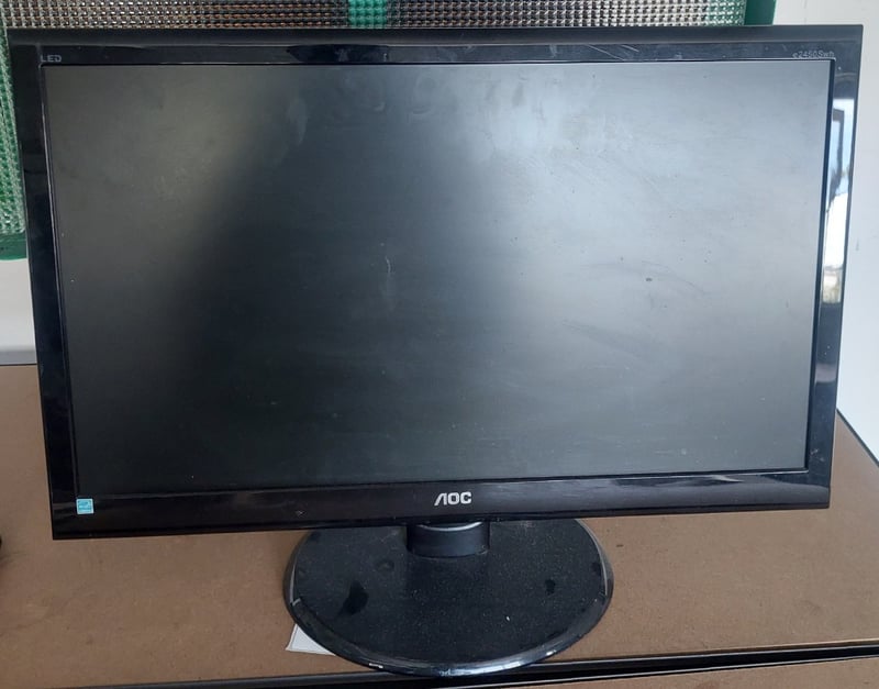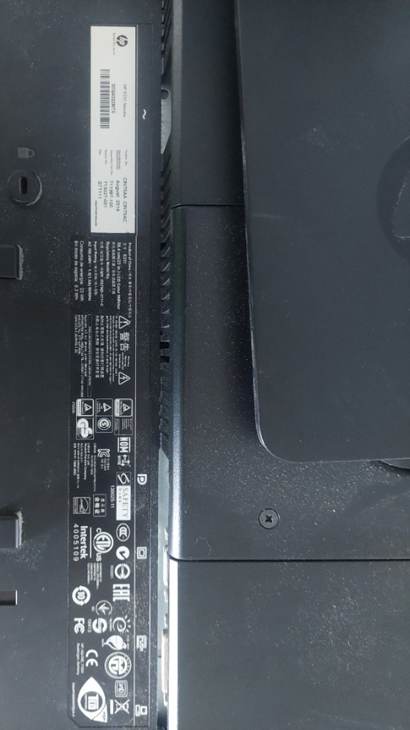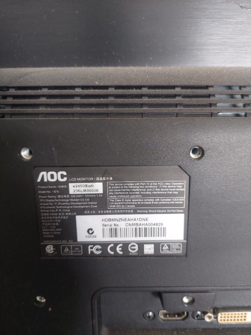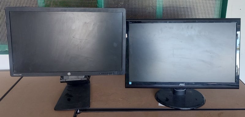 Assorted monitor screens.AOC LCD monitorModel: 236LM00006Serial number: CNMBAHA004829Dims: 56.5cm L, 40cm H, 3cm WHP MonitorModel: E231Serial number: 3CQ4322MTXDims: 55cm L, 52 cm H, 4cm WSold as a lot.Note: items are untested, signs of wear.