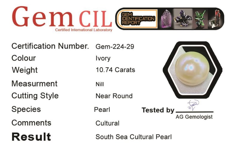10.74 CARATS SOUTH SEA PEARL 10.74 Carats South Sea Pearl Stone = South Sea Pearl Weight = 10.74 Carats Treatment = CulturalQuantity = 1Note = Gem Cil, Certified 0+29