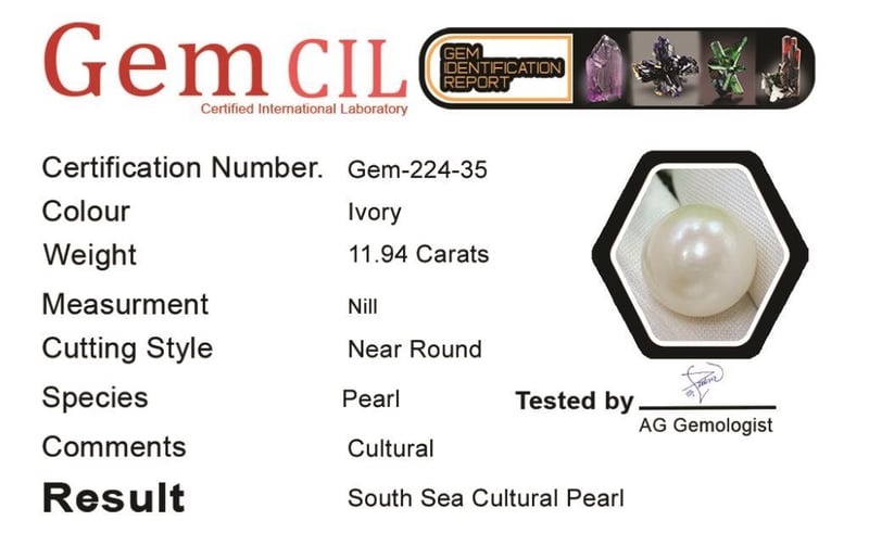 11.94 CARATS SOUTH SEA PEARL 11.94 Carats South Sea Pearl Stone = South Sea Pearl Weight = 11.94 CaratsColour = IvoryTreatment = CulturalQuantity = 1Note = Gem Cil, Certified, 0+35