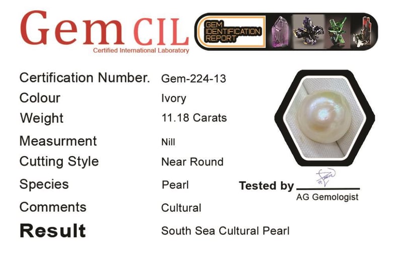 11.18 CARATS SOUTH SEA PEARL 11.18 Carats South Sea Pearl Stone = South Sea Pearl Weight = 11.18 Carats Colour = IvoryTreatment = CulturalNote = Gem Cil, Certified, 0+13