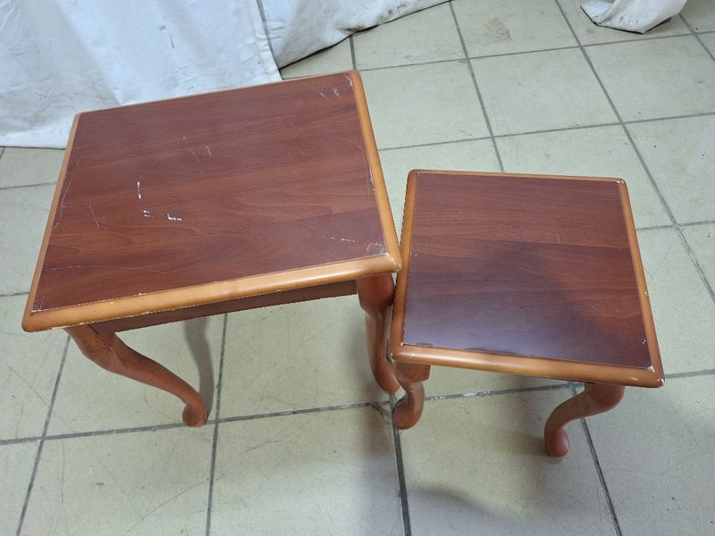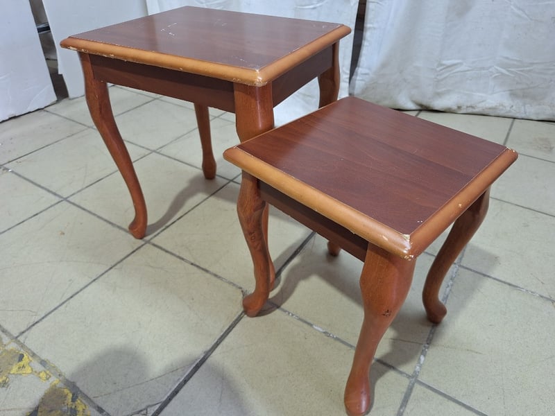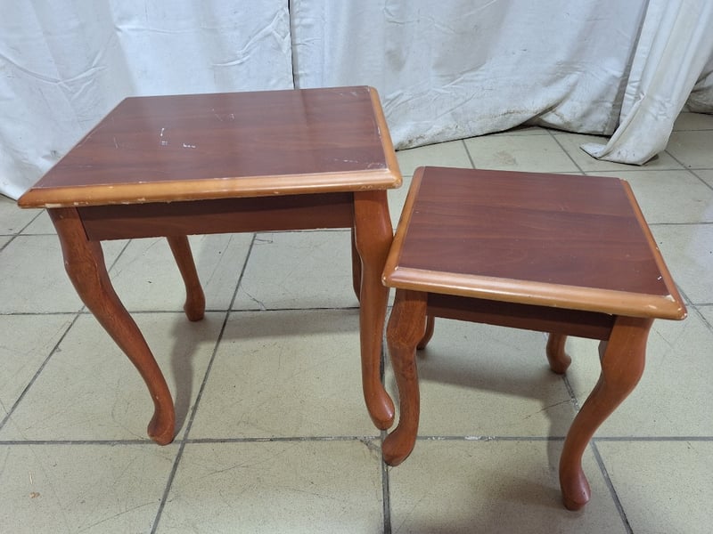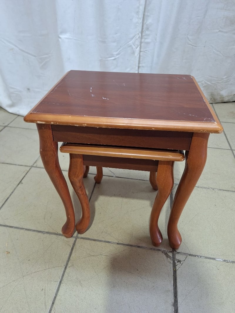 X2 Side Tables, Timber Style, Brown Finish Dimensions Small H:36cm W:28cm D:30cm Dimensions Big H:45cm W:40cm D:34cm