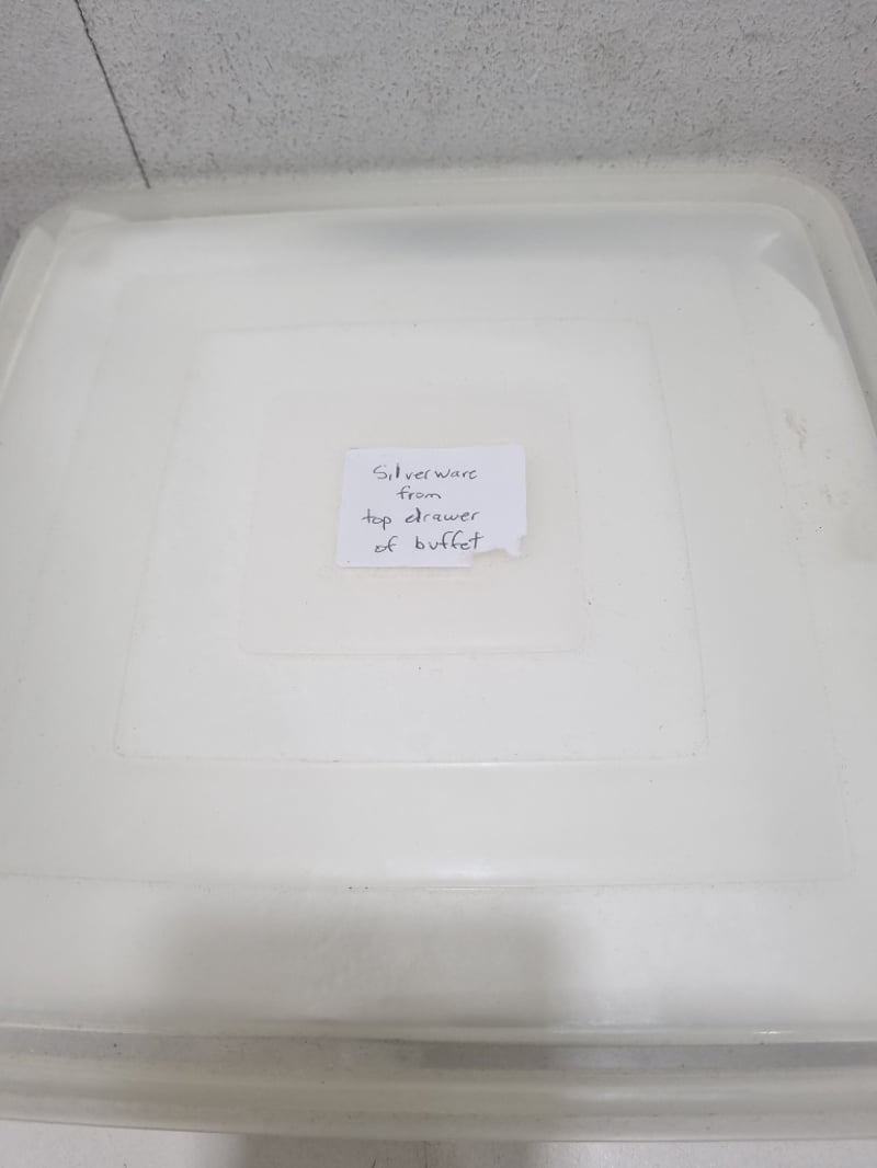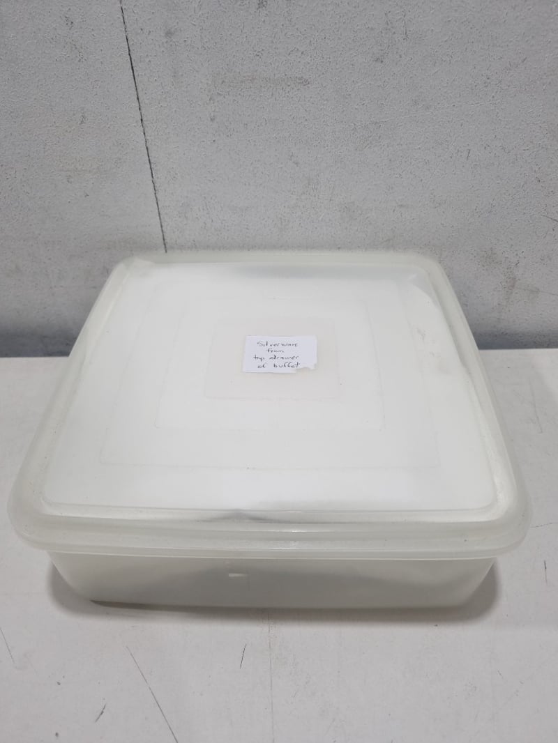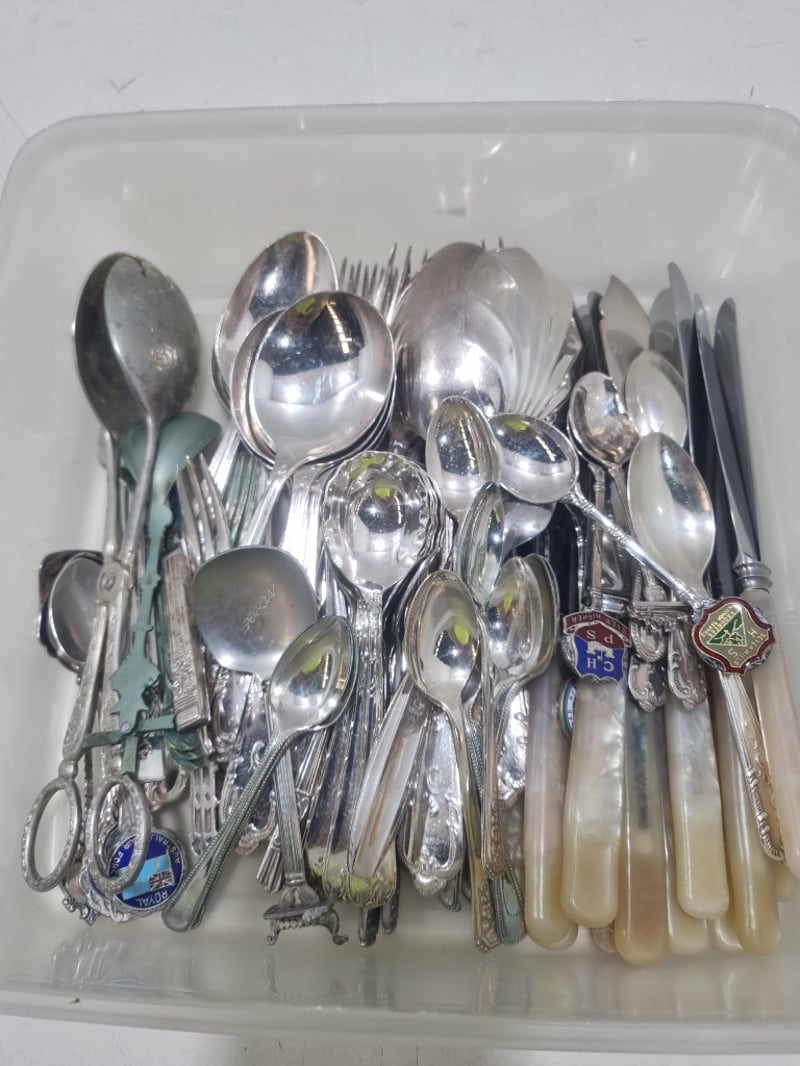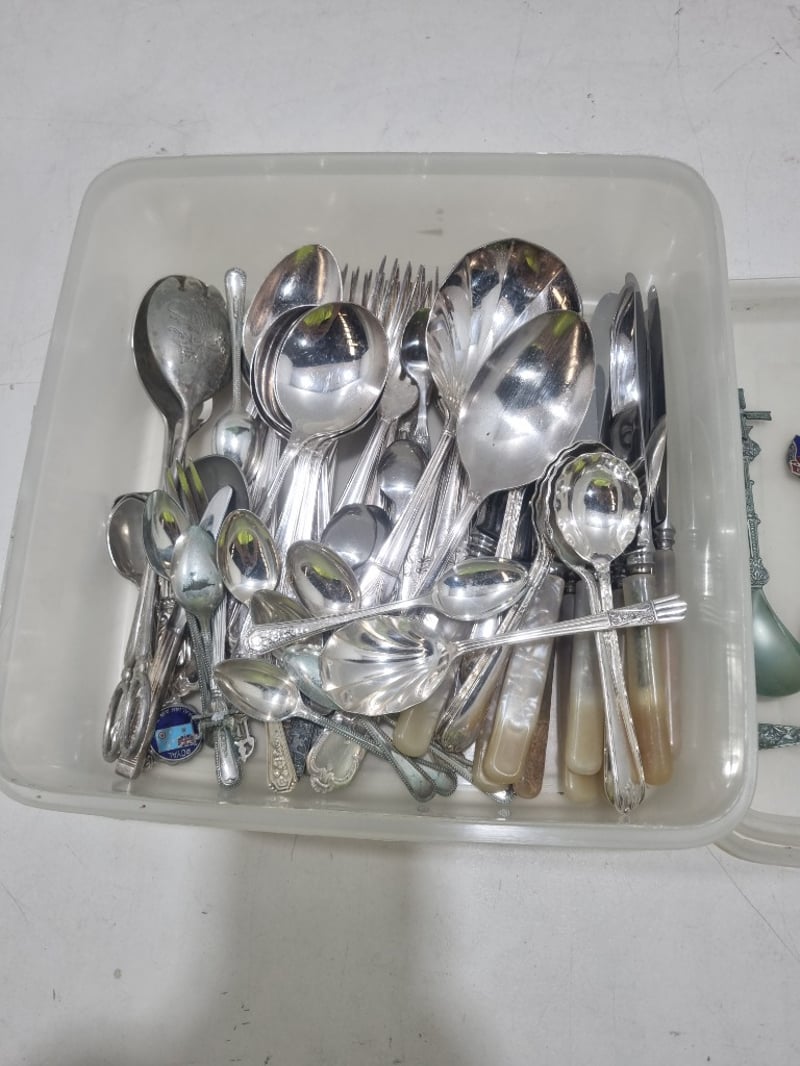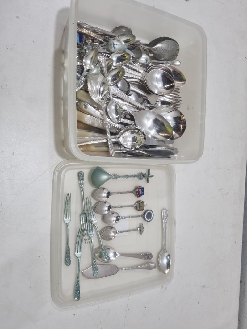 Vintage like silverware collection included teaspoons, dessert spoons, and tablespoons in polished silver with decorative handles featuring enamel embellishments (blue and red stone inlays). Additional items include serving utensils, forks with bone/cream-coloured handles, decorative serving spoon with green stone finial, and specialty pieces with commemorative enamel badges. One container stores the main bulk flatware collection; the second smaller container displays individual specialty pieces arranged for presentation.Sold as lot Note: signs of wear and tear