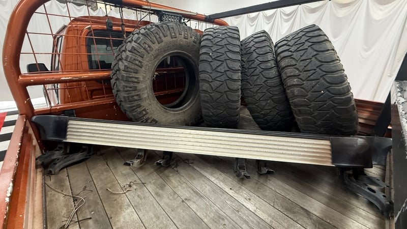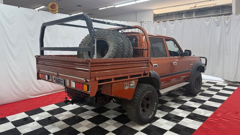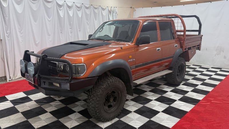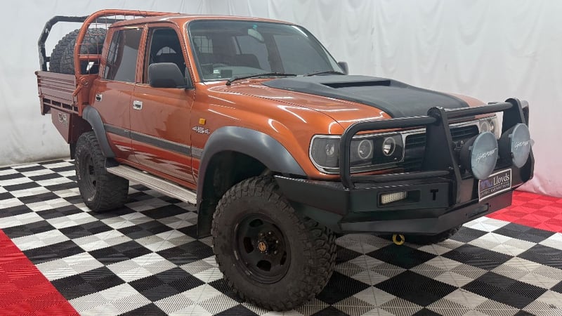 1994 Toyota LandCruiser 80 Series dual‑cab utility finished in distinctive gold/orange. Four‑wheel drive configuration powered by a formidable 7.4‑litre (454ci) Chevrolet V8 petrol engine, paired with a 5‑speed manual transmission. Odometer indicating 545,800 kilometres.