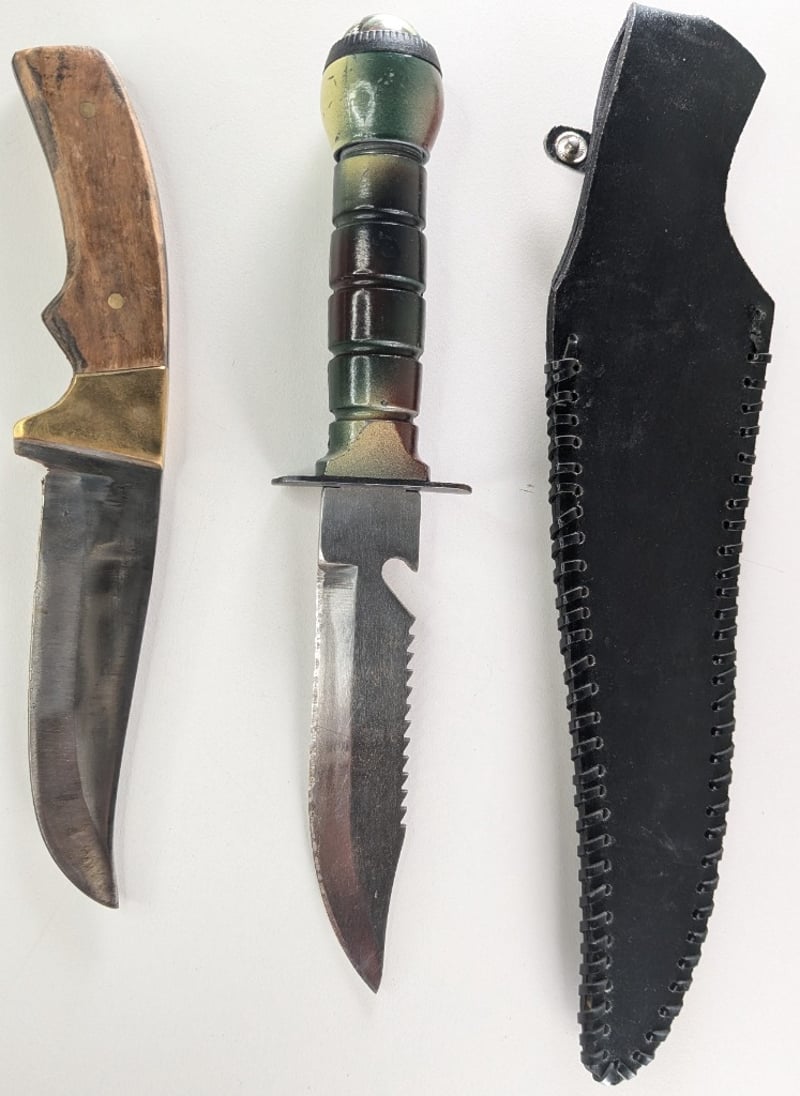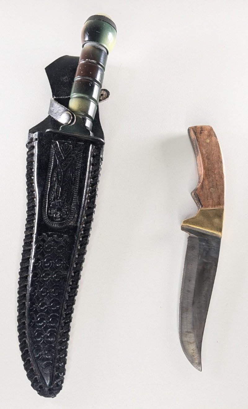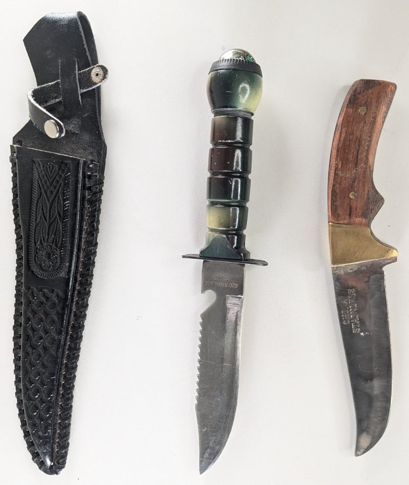 HUNTING KNIFES, QTY 2.Item Size: Height: 33cm, Width: 2cm, Depth: 2cm, Weight: 1KgChina Stanless Steel Knife And Taiwan Stainless Knife With Case.Condition: Good - Refer To ImagesFC2A163011+60