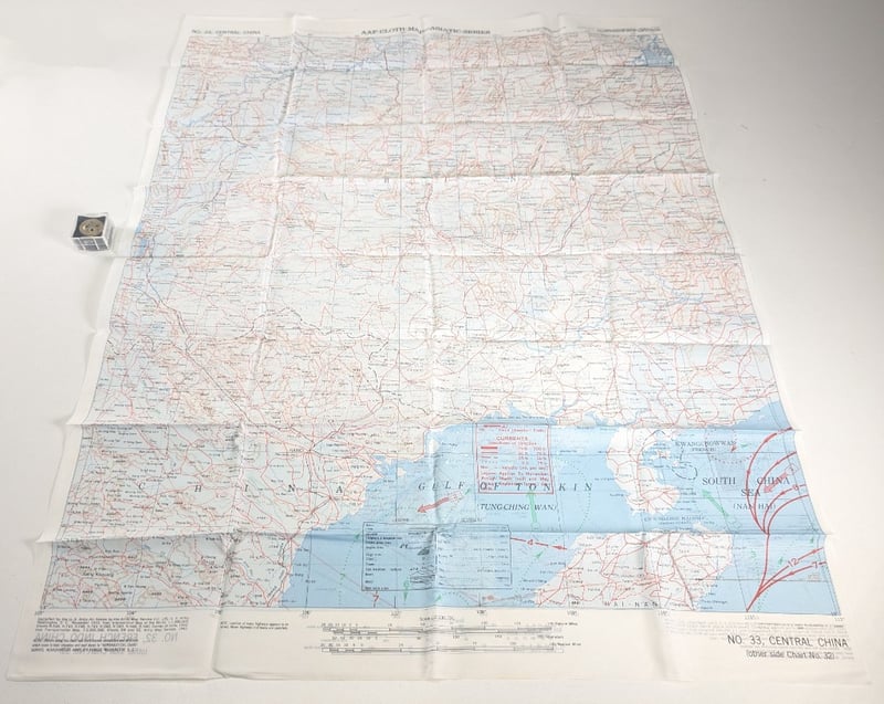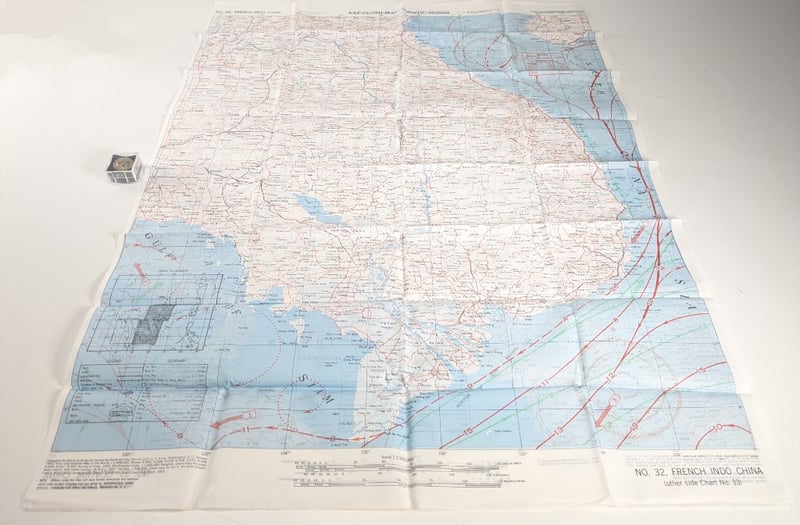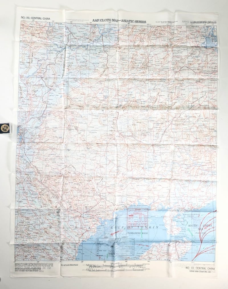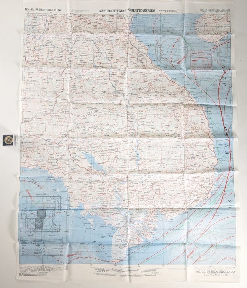ORIGINAL AAF MILITARY CLOTH MAP, ASIATIC SERIES (FRENCH INDO CHINA), AND BUTTON COMPASS WWII.Item Size: Height: 63cm, Width: 50cm, Depth: 1cm, Weight: 1KgButton Compass With Dials Unopen.Condition: Good - Refer To ImagesFC2A163011+26