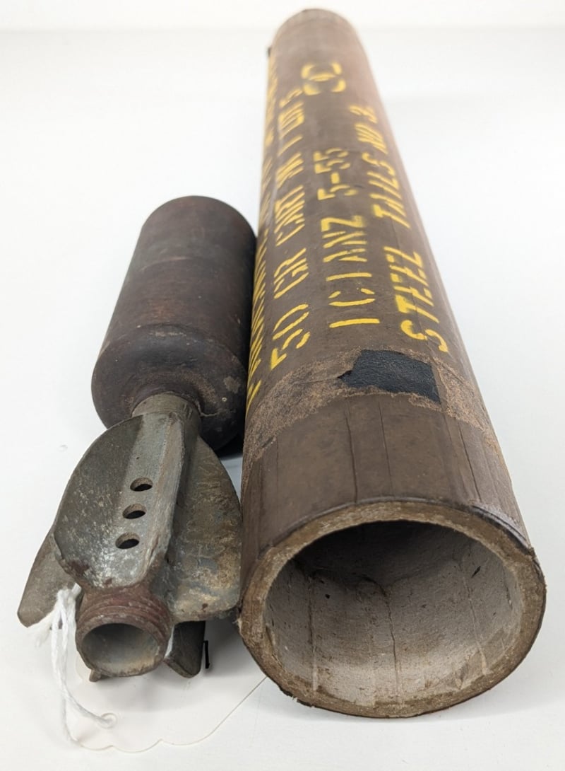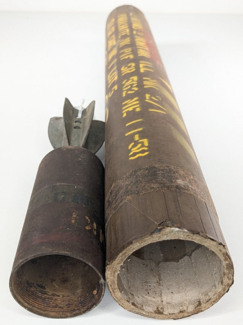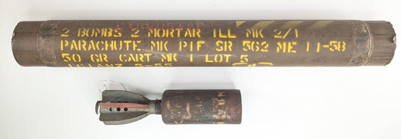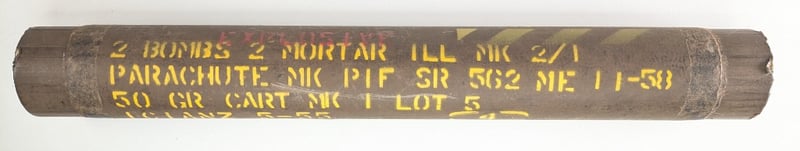 PARACHUTE MORTAR 1941 AND PARACHUTE CANNISTER 1958.Item Size: Height: 50cm, Width: 6cm, Depth: 6cm, Weight: 5KgCondition: Good - Refer To ImagesFC2A163011+7