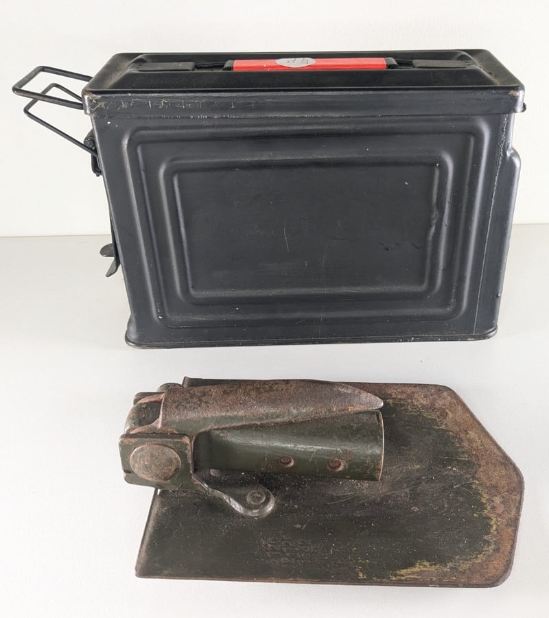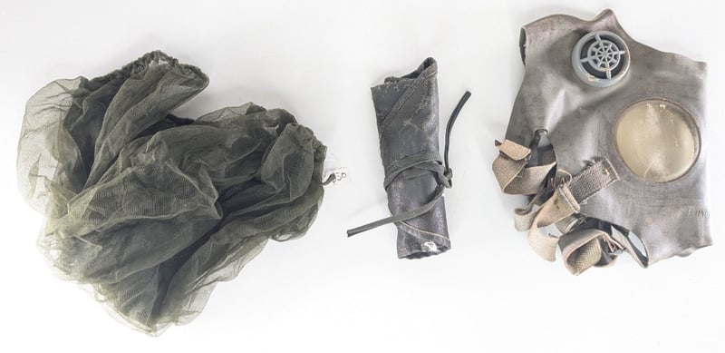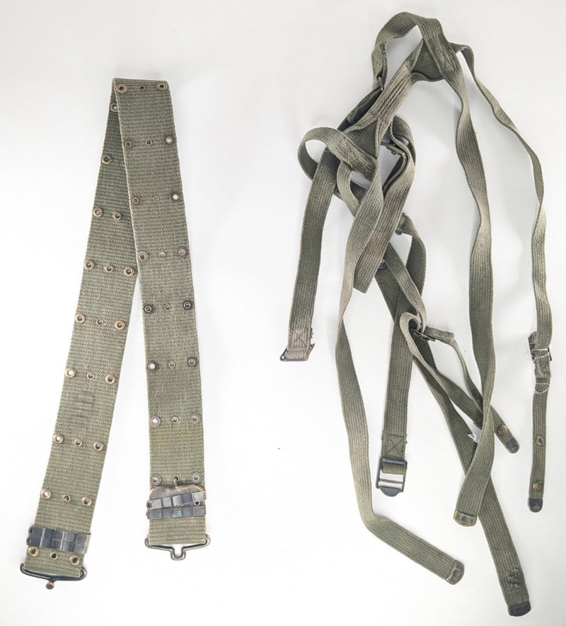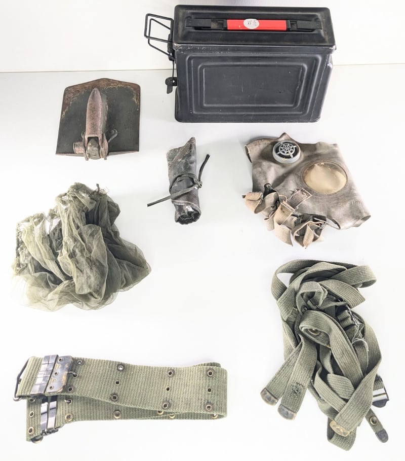 Shovel No Handle 1964, Slr Cleaning Kit, Harness Straps For Webbing, Mosquito Net And Belt, Ammo Tin, Gas Mask. All Original And Used.
