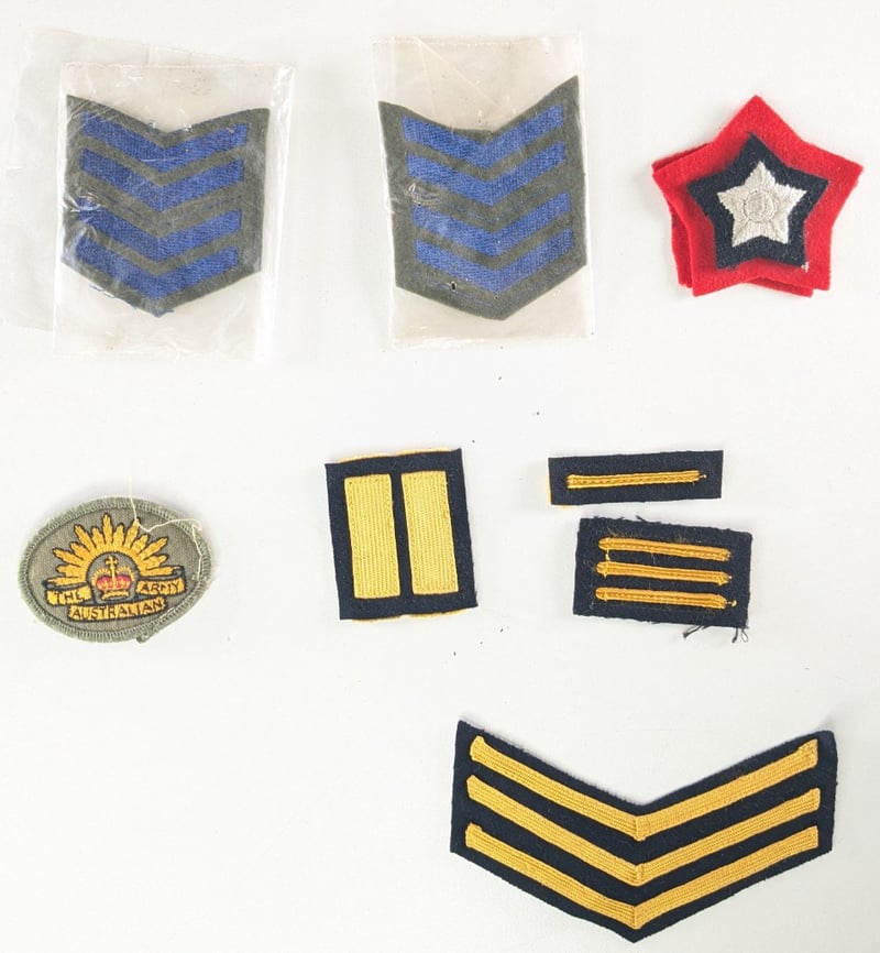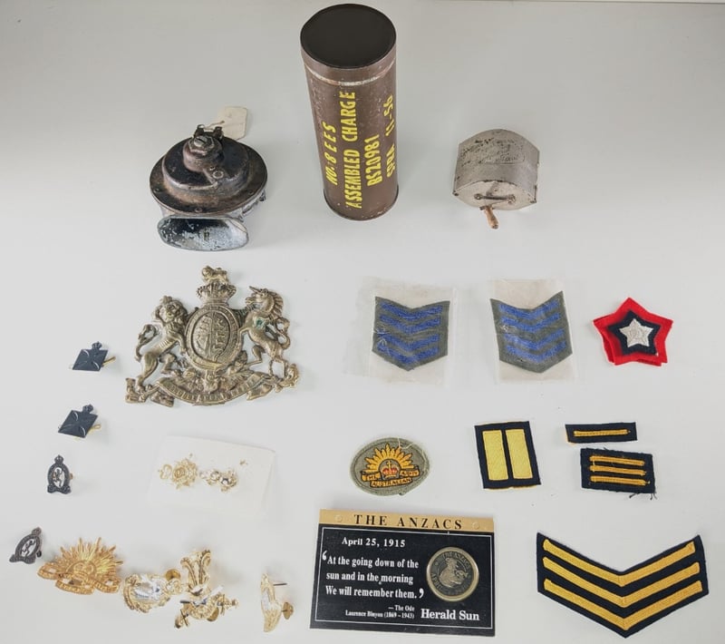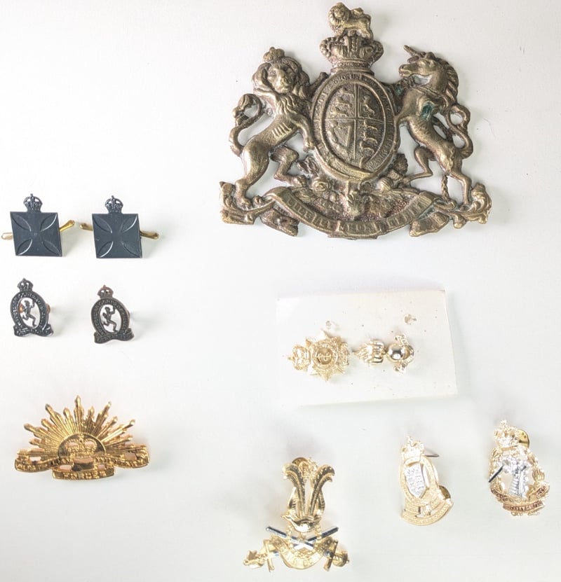 ASSORTED MILITARY COLLECTION.Item Size: Height: 1cm, Width: 1cm, Depth: 1cm, Weight: 1KgMilitary Horn, Razor Sharpener, Australian Military Badges And Patches, Uk Plaque, Canister.Condition: Good - Refer To ImagesFC2A163011+48
