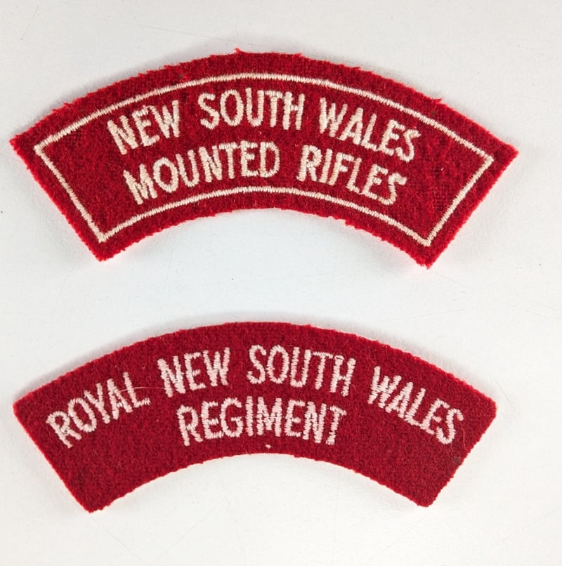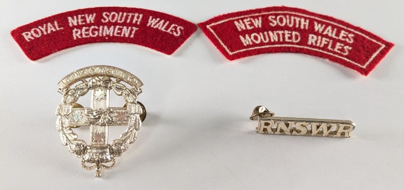 PATCHES AND BADGES, ROYAL NSW REGIMENT.Item Size: Height: 1cm, Width: 1cm, Depth: 1cm, Weight: 1Kg'New South Wales Mounted Rifles' Patch, 'Royal New South Wales Regiment' Patch, Rbswr Pin, Royal Nsw Regiment.Condition: Good - Refer To ImagesFC2A163011+55