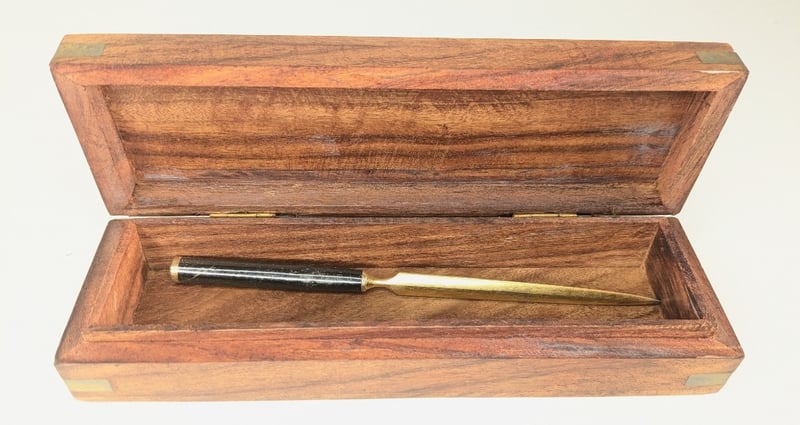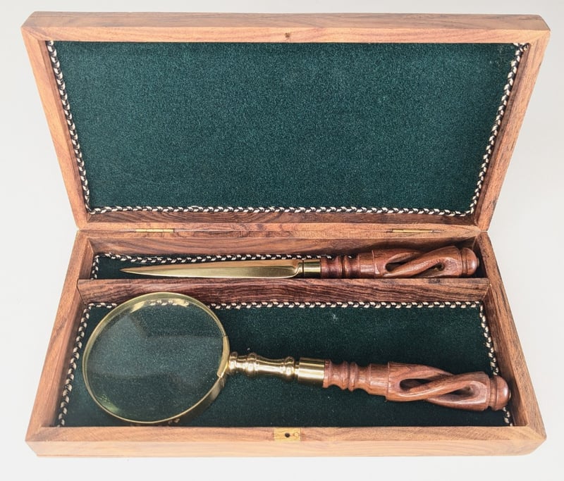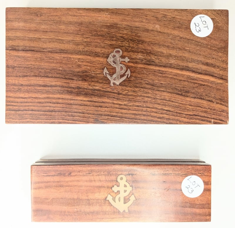 NALAL (NAVY) BOX. CONTENTS INCLUDE MAGNIFYING GLASS, LETTER OPENERS.Item Size: Height: 25cm, Width: 13cm, Depth: 4cm, Weight: 1KgIncludes 2 Wooden Boxes, 2 Letter Openers And, 1 Magnifying Glass.Condition: Good - Refer To ImagesFC2A163011+23