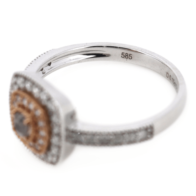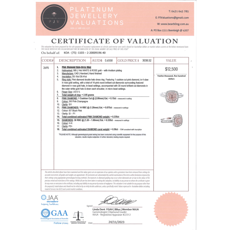 14K WHITE/ROSE GOLD, PINK DIAMOND AND DIAMOND, DOUBLE HALO RING. The Center Features, One Cushion Cut, Pink-Champagne, Diamond (0.15Ct, Si1 Clarity), 4 Claw Set In Rose Gold. Surrounding The Centre In A Halo Are, 14 Round Brilliant Cut, Blush Pink, Diamonds (0.075Ct Tdw, Si-P1 Clarity), Micro-Bead Set In Rose Gold With Millegrain Detail. Embellishing The Design And Band Are, 30 Round Brilliant Cut, Diamonds (0.335Ct Tdw, H-K Colour, P2+ Clarity), Bead Set In White Gold With A Millegrain Detail. Ring Size M 1/2. Valuations Provided by an Independent Third-Party Professional Not Directly Associated With Lloyds Auctions at AUD $$12,500.00This valuation has been conducted by an independent third-party professional. The valuation amount is an assessment by the issuing valuer and does not reflect the auction value of the item. Any inquiries regarding the valuation should be directed to the issuing valuer (refer to contact details on the certificate), as Lloyds Auctions has no affiliation or influence over the valuation, the valuer, or the stated amount. Condition: Good - Refer Images 0+1572