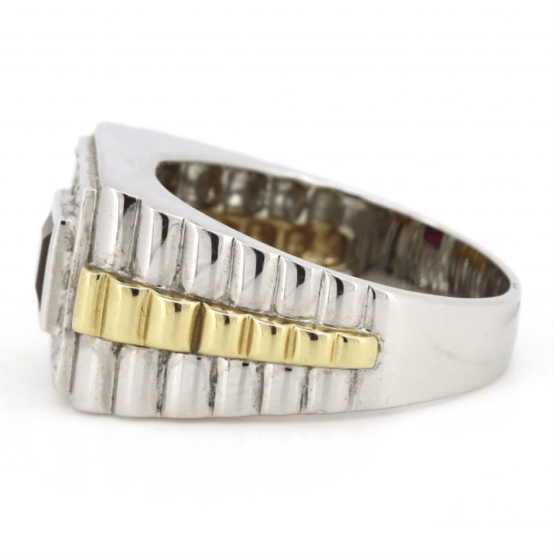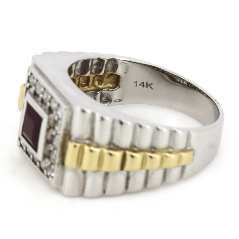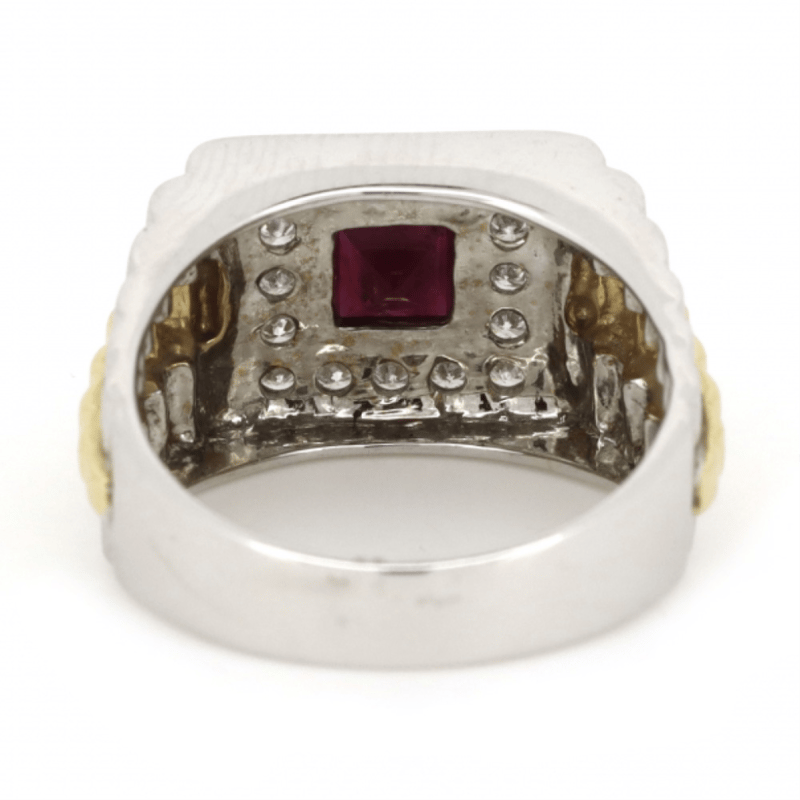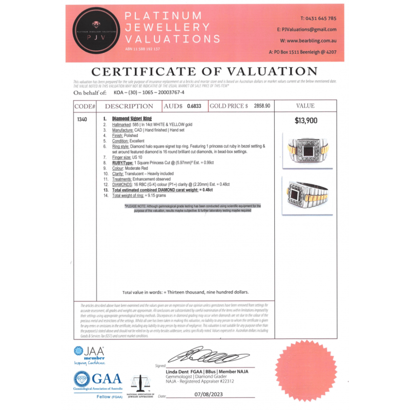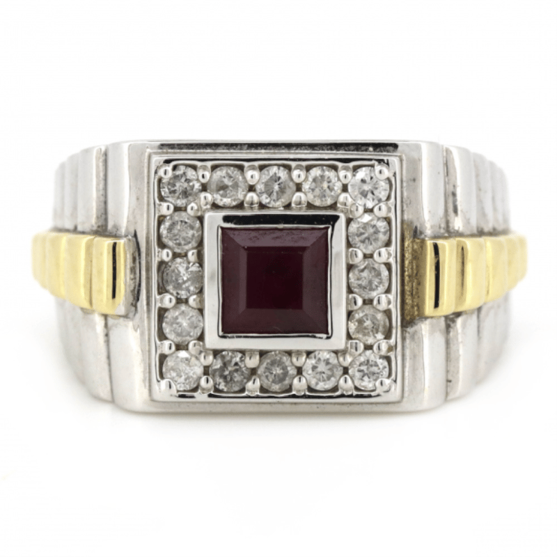 14K WHITE/YELLOW GOLD, RUBY AND DIAMOND, GENTS RING. The Centre Features, One Square Princess Cut, Moderate Red, Ruby (0.99Ct Tsw, Heavily Included), Bezel Set In White Gold. Surrounding The Centre In A Halo Are, 16 Round Brilliant Cut, Diamonds (0.48Ct Tdw, G-K Colour, P1+ Clarity), Claw Set. Ring Size. T 1/2. Valuations Provided by an Independent Third-Party Professional Not Directly Associated With Lloyds Auctions at AUD $$13,900.00This valuation has been conducted by an independent third-party professional. The valuation amount is an assessment by the issuing valuer and does not reflect the auction value of the item. Any inquiries regarding the valuation should be directed to the issuing valuer (refer to contact details on the certificate), as Lloyds Auctions has no affiliation or influence over the valuation, the valuer, or the stated amount. Condition: Good - Refer Images 0+1597