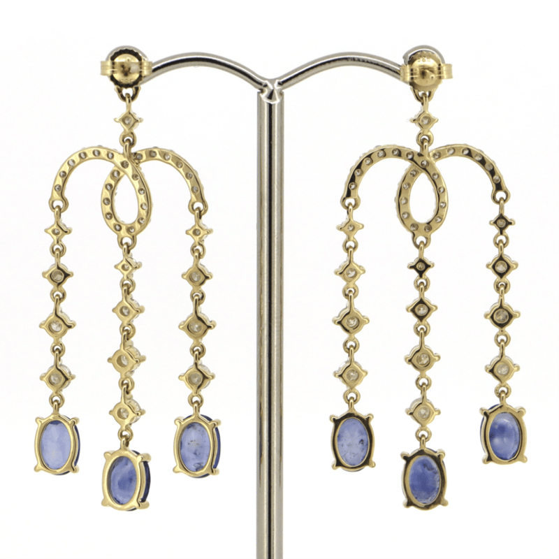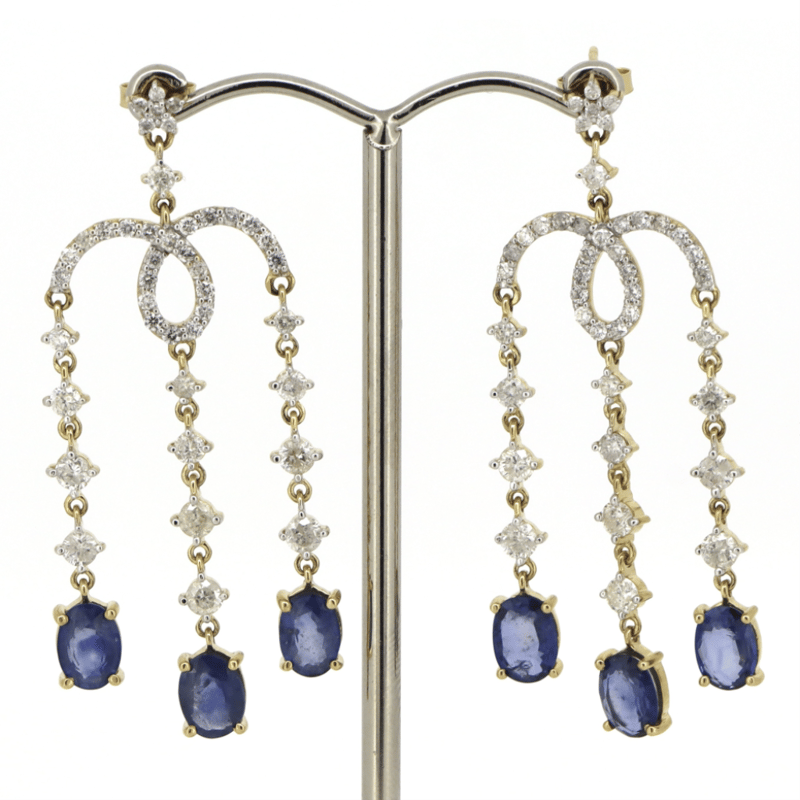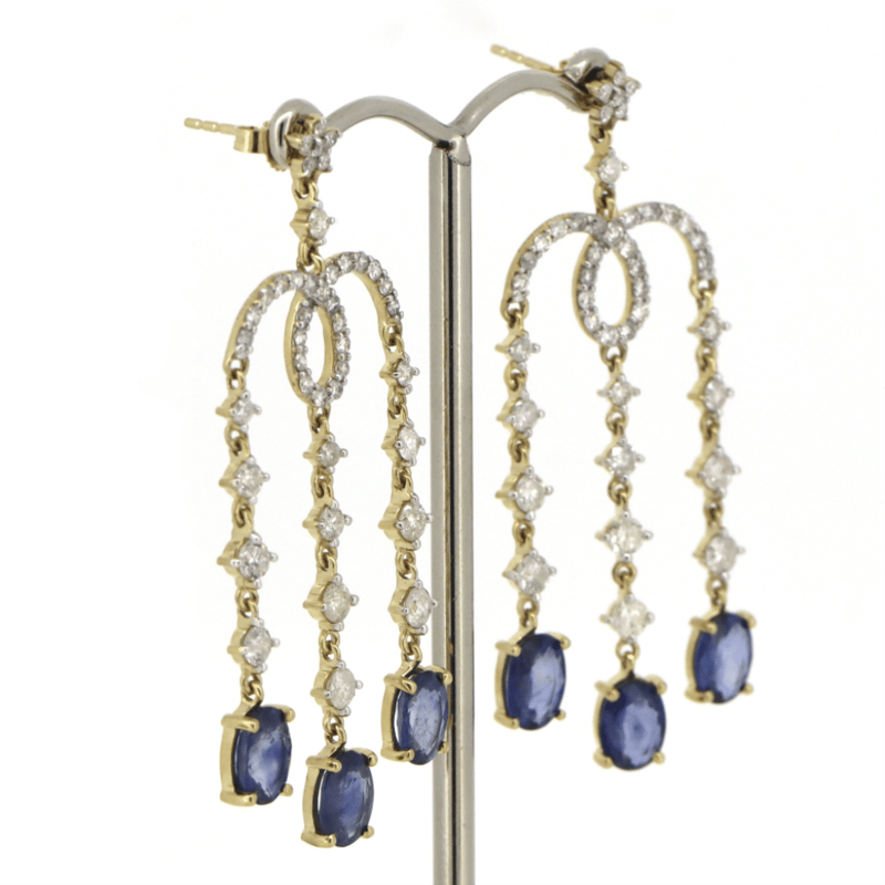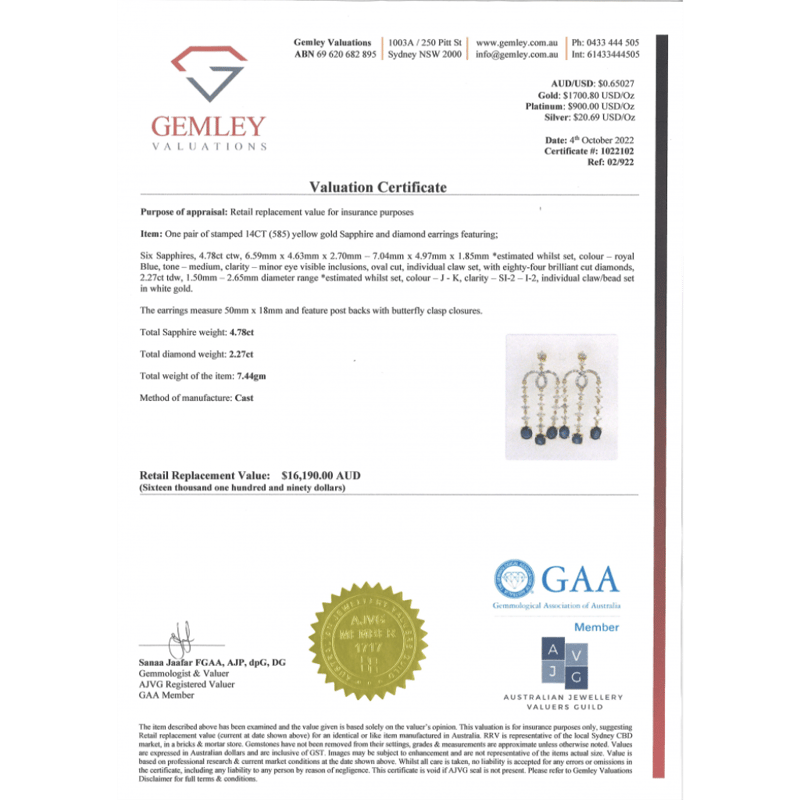 14K YELLOW GOLD, BLUE SAPPHIRE AND DIAMOND, CHANDELIER EARRINGS. The Design Features, 6 Oval Cut, Royal Blue, Sapphires (4.78 Tsw, Minor Eye Visible Inclusions), Claw Set. Encompassing The Central Design Are, 84 Round Brilliant Cut, Diamonds (2.27Ct Tdw, J-K Colour, Si2-I2 Clarity), Claw/Bead Set In White Gold. The Earrings Have Post Backs, With 14K Yellow Gold Butterfly Clasps. Valuations Provided by an Independent Third-Party Professional Not Directly Associated With Lloyds Auctions at AUD $$16,190.00This valuation has been conducted by an independent third-party professional. The valuation amount is an assessment by the issuing valuer and does not reflect the auction value of the item. Any inquiries regarding the valuation should be directed to the issuing valuer (refer to contact details on the certificate), as Lloyds Auctions has no affiliation or influence over the valuation, the valuer, or the stated amount. Condition: Good - Refer Images 0+1574