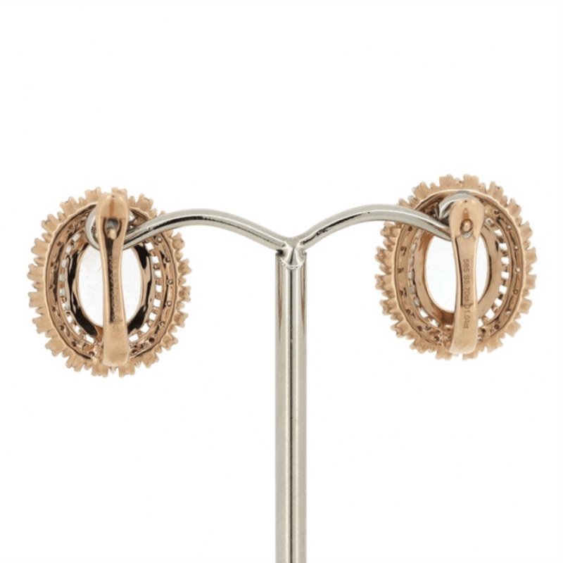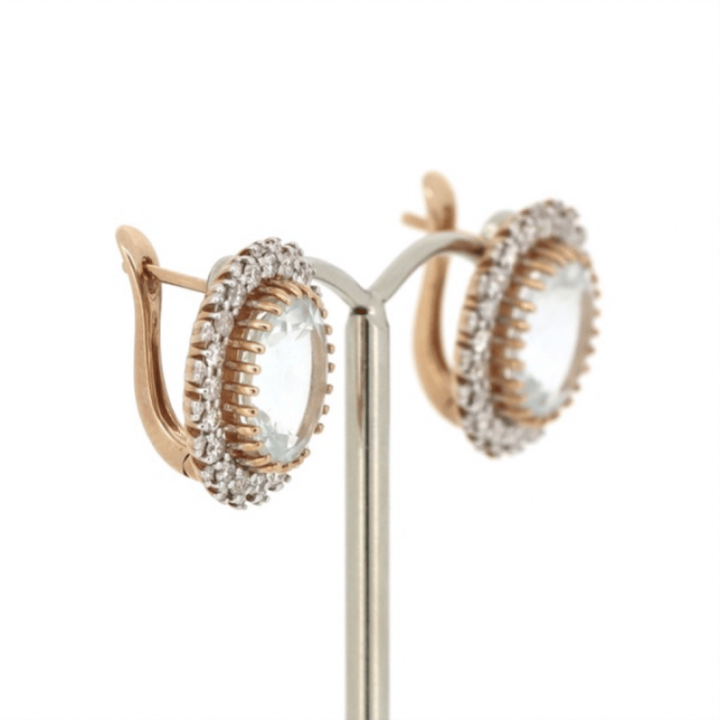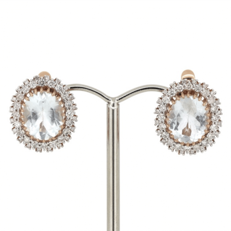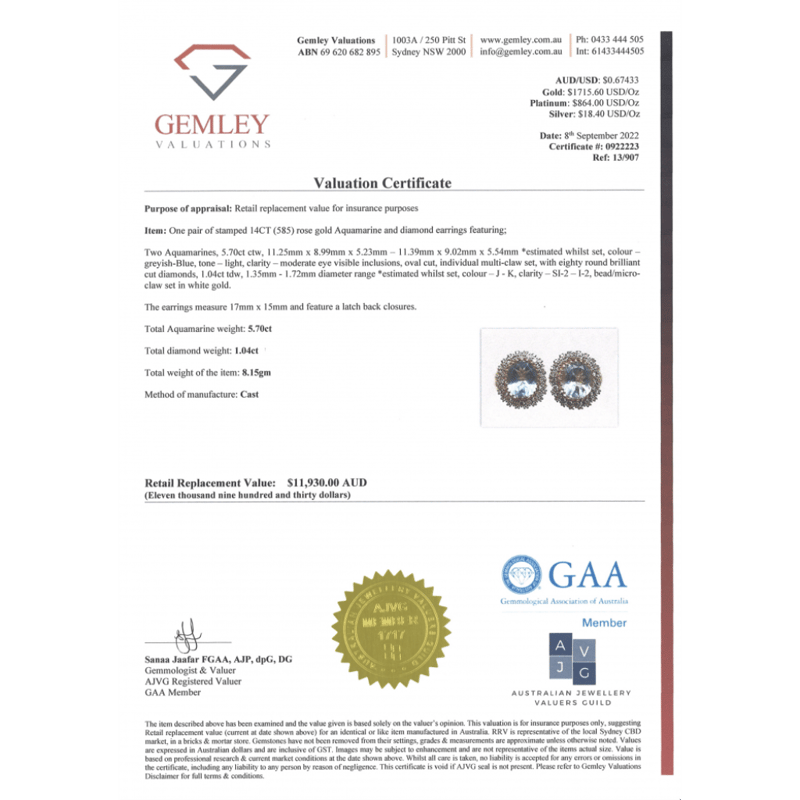 14K ROSE GOLD, AQUAMARINE AND DIAMOND, EARRINGS. The Centres Feature, 2 Oval Cut, Light Greyish-Blue, Aquamarines (5.70Ct Tsw, Moderate Eye Visible Inclusions), Multi-Claw Set. Surrounding The Centres In Decorative Halos Are, 80 Round Brilliant Cut, Diamonds (1.04Ct Tdw, J-K Colour, Si2-I2 Clarity), Bead/Micro-Claw Set In White Gold. The Earrings Have Latch Back Closures. Valuations Provided by an Independent Third-Party Professional Not Directly Associated With Lloyds Auctions at AUD $$11,930.00This valuation has been conducted by an independent third-party professional. The valuation amount is an assessment by the issuing valuer and does not reflect the auction value of the item. Any inquiries regarding the valuation should be directed to the issuing valuer (refer to contact details on the certificate), as Lloyds Auctions has no affiliation or influence over the valuation, the valuer, or the stated amount. Condition: Good - Refer Images 0+1545