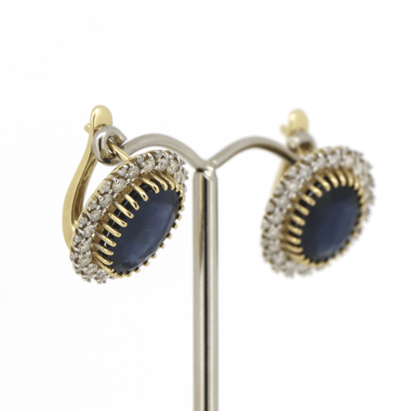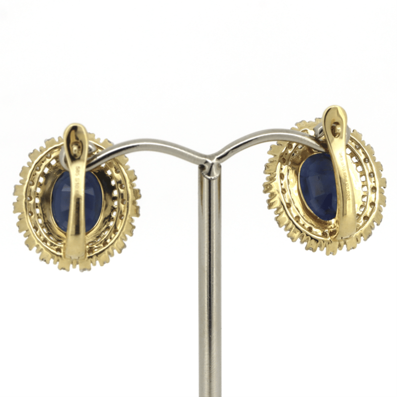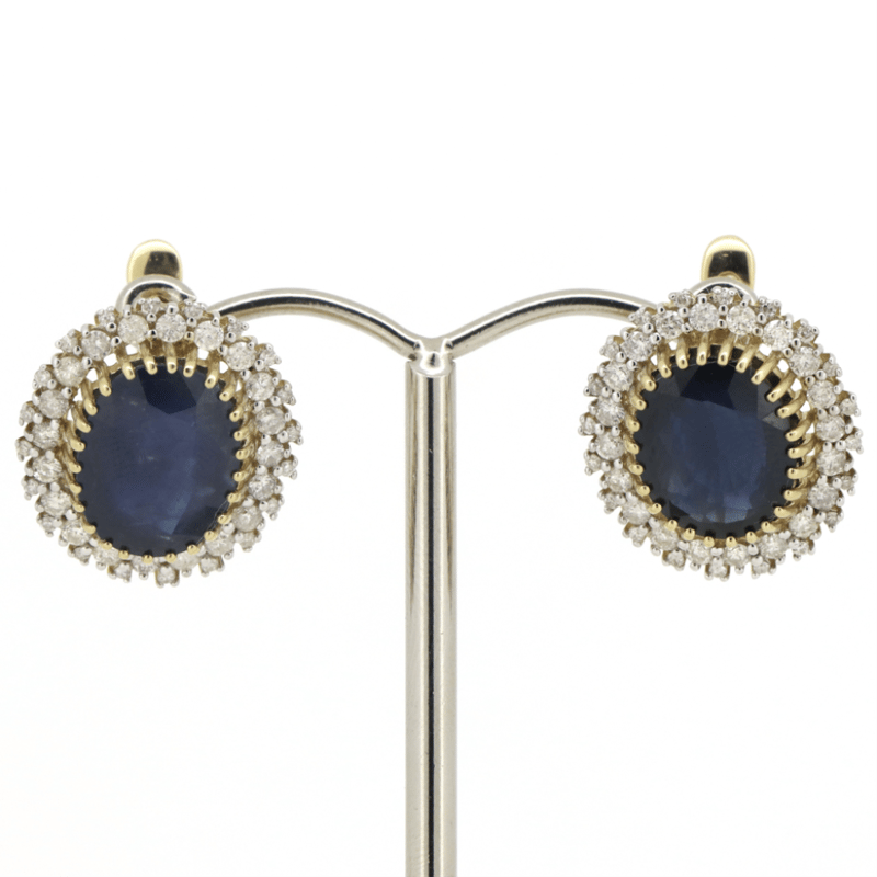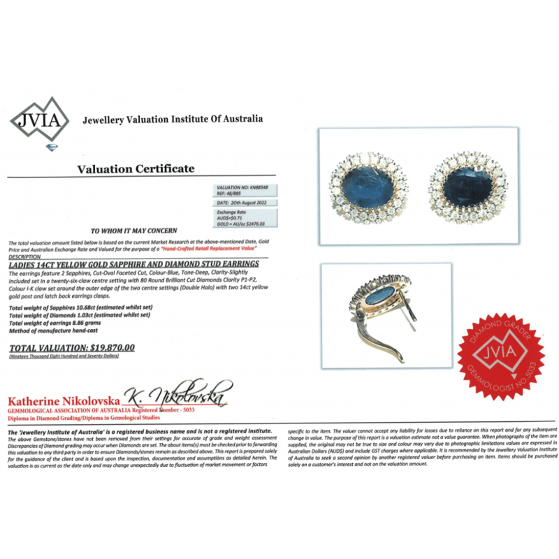 14K YELLOW GOLD, BLUE SAPPHIRE AND DIAMOND, EARRINGS. The Earrings Feature, 2 Oval Faceted Cut, Deep Blue, Sapphires (10.68Ct Tsw, Slightly Included), Multi-Claw Set. Surrounding The Sapphires In Individual Decorative Halos Are, 80 Round Brilliant Cut, Diamonds (1.03Ct Tdw, I-K Colour, P1-P2 Clarity), Claw Set. The Earrings Have Latch Back Closures. Valuations Provided by an Independent Third-Party Professional Not Directly Associated With Lloyds Auctions at AUD $$19,870.00This valuation has been conducted by an independent third-party professional. The valuation amount is an assessment by the issuing valuer and does not reflect the auction value of the item. Any inquiries regarding the valuation should be directed to the issuing valuer (refer to contact details on the certificate), as Lloyds Auctions has no affiliation or influence over the valuation, the valuer, or the stated amount. Condition: Good - Refer Images 0+1576